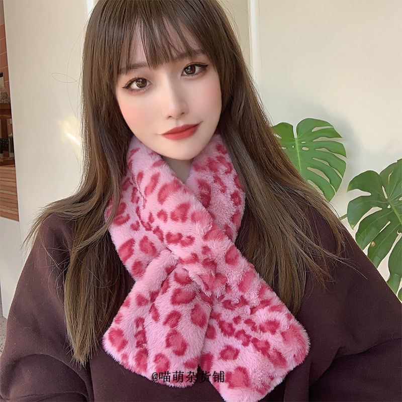 핑크색 레오파드 프린트 짧은 스카프 여성용 겨울 따뜻한 부드러운 플러시 크로스 스카프 두꺼운 트렌디 다용도 귀여운