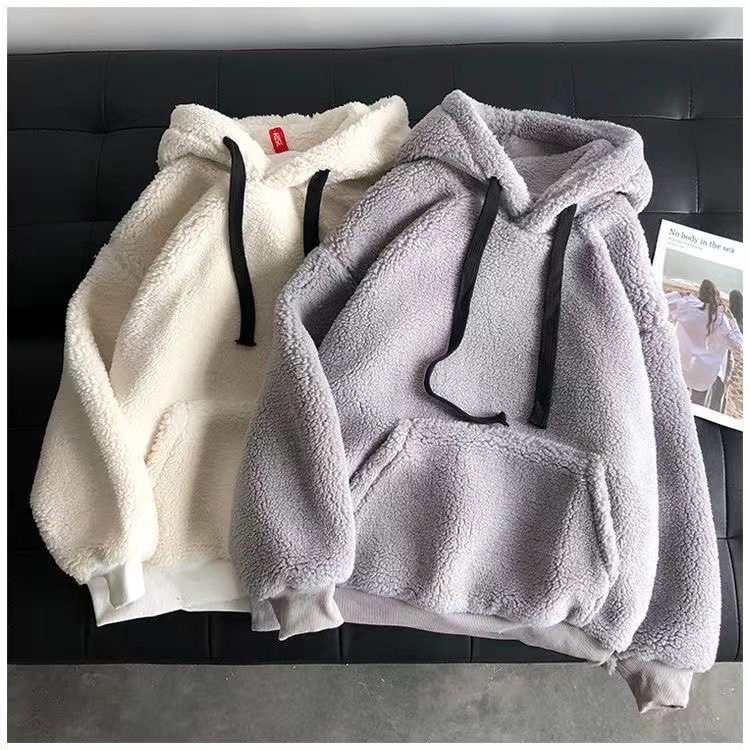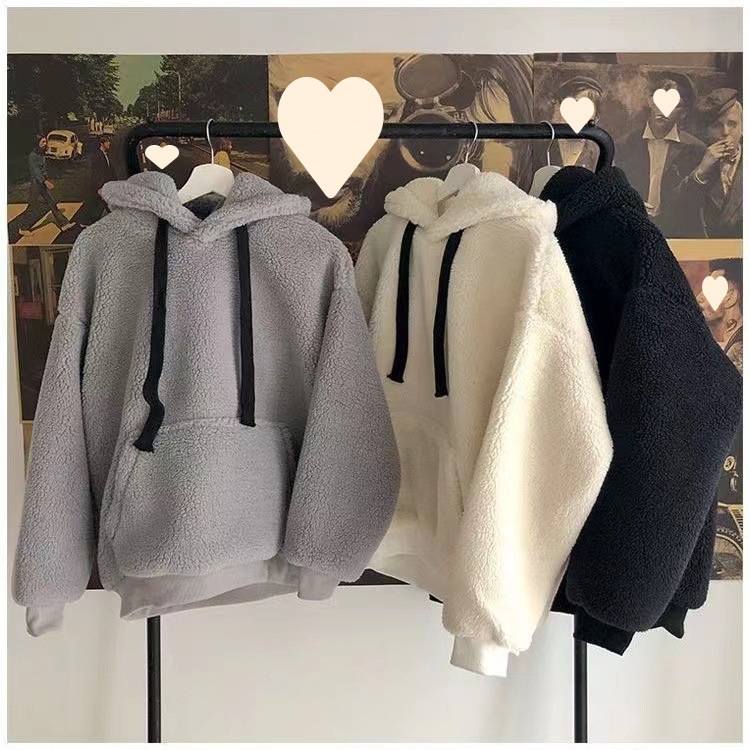 양털 느낌 스웨트셔츠 겨울 여성용 한국 스타일 심플 커플룩 남녀공용 후드티 두꺼운 루즈핏 상의스토어 가기