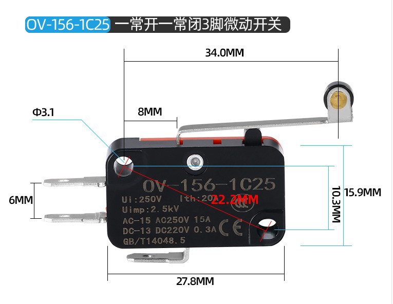 플라스틱 금속 휠 리미트 스위치 여행 스위치 구리 접촉 긴 손잡이를 V-156-1C25 마이크로 스위치