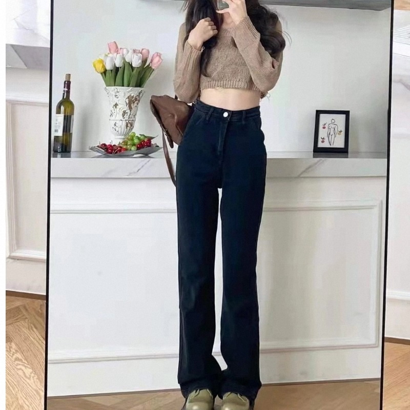 2023 블랙 스트레이트 청바지 여성의 하이 허리 기모 바지 가을 슬리밍 파이프 바지 가을과 겨울 키 큰 바지스토어 가기