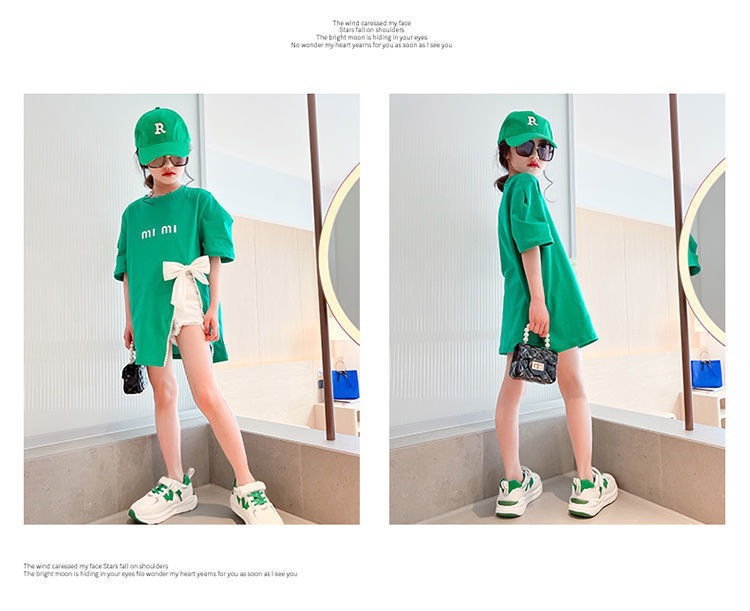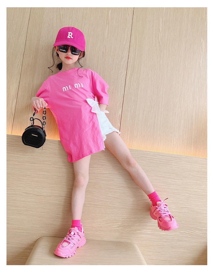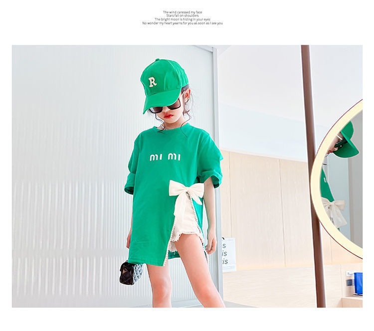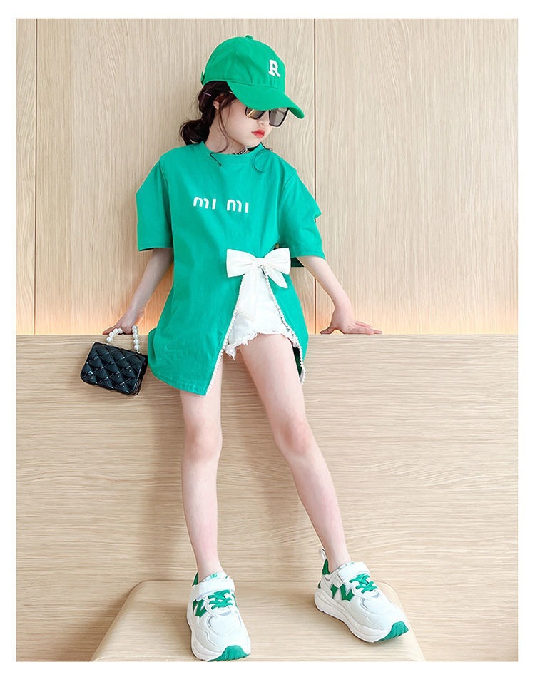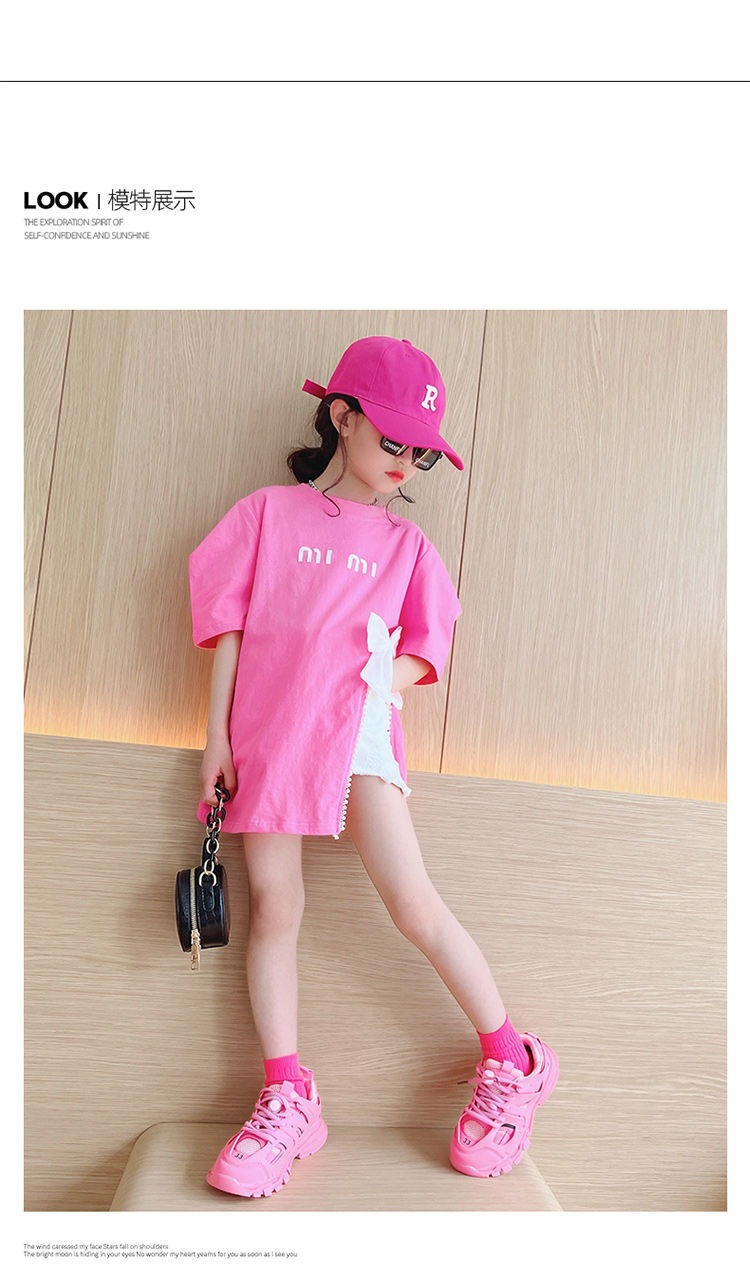 소녀의 면 티셔츠 한국식 반팔 여름 유행 소녀의 나비 탑 큰 어린이 스플릿 여름 티셔츠 유행