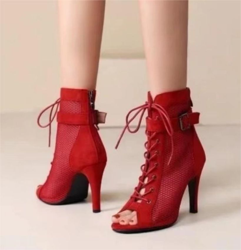 국경 대형 유럽과 미국의 패션 새로운 물고기 입 중공 메쉬 크로스 레이스 버클 섹시한 하이힐 댄스 신발 여성을위한