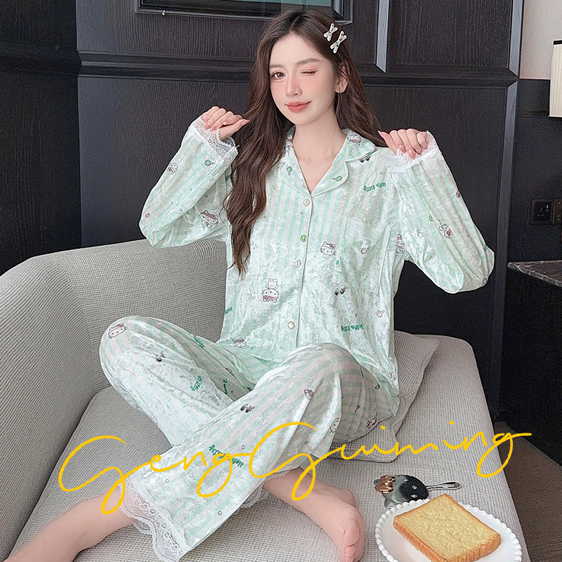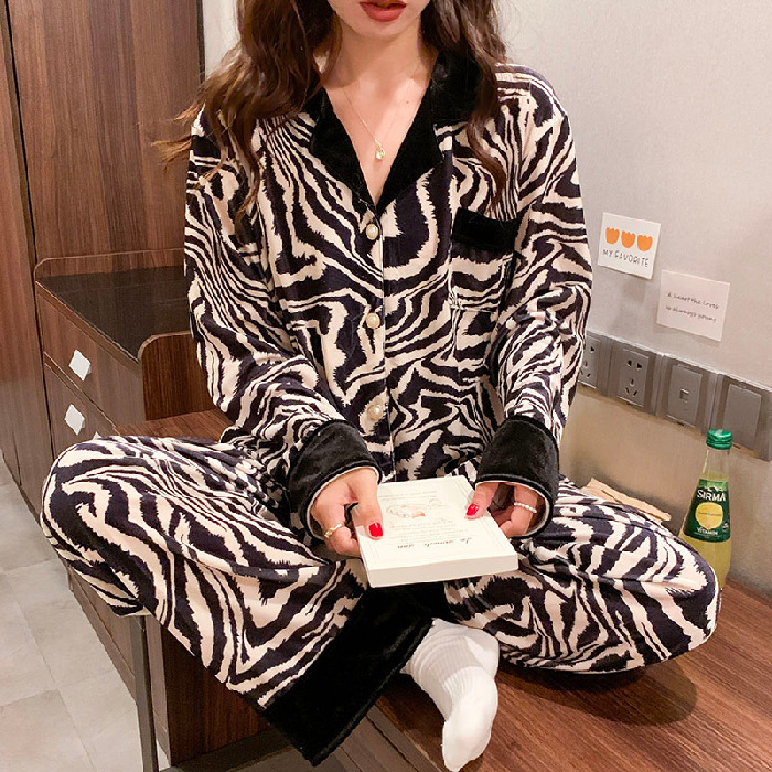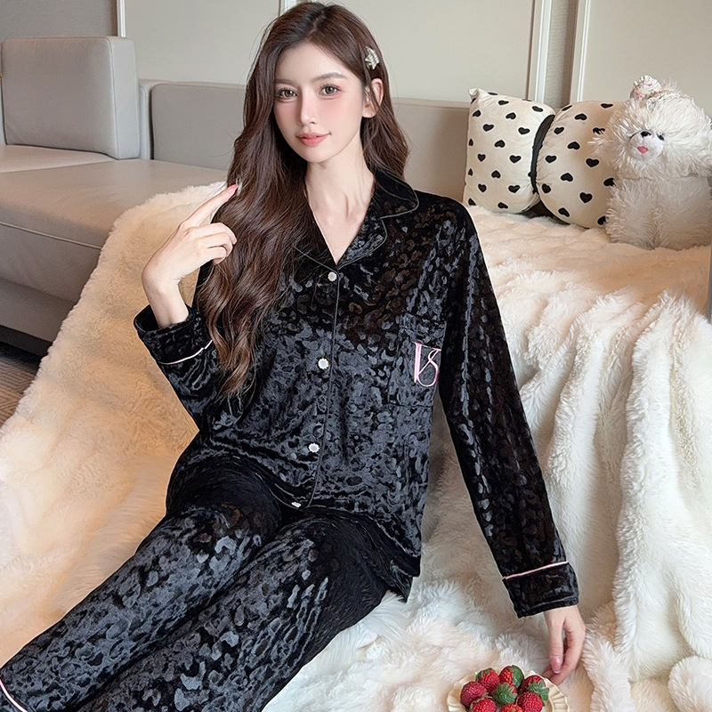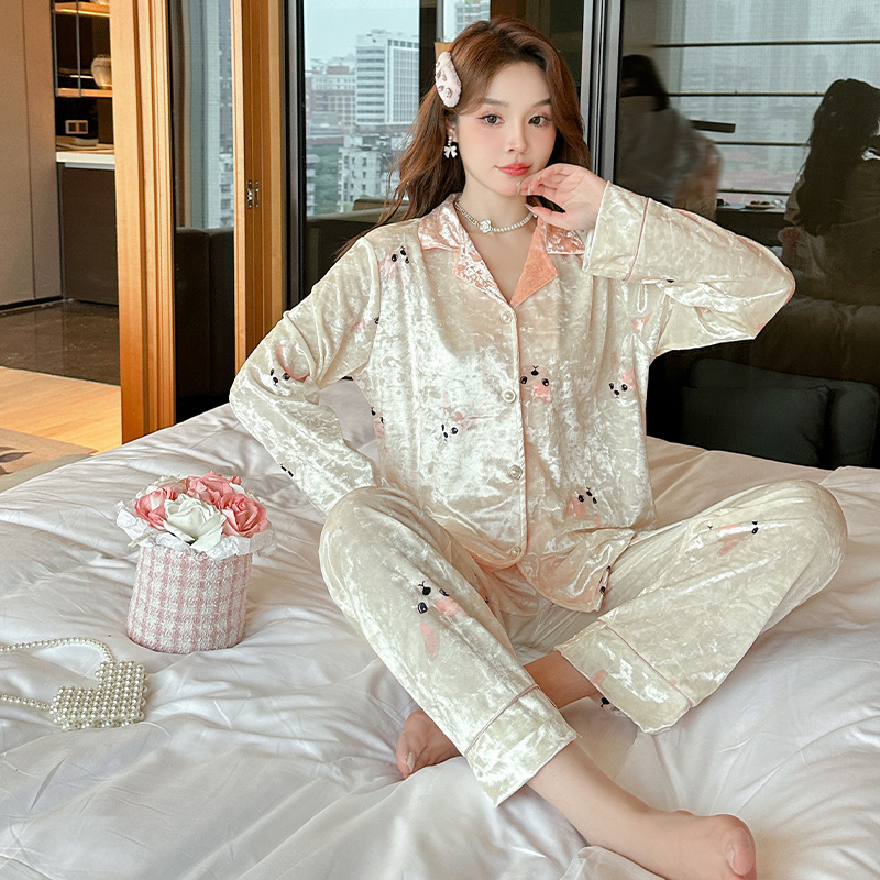 라이브 인터넷 연예인 패션 골드 벨벳 가을과 겨울 긴 소매 가벼운 럭셔리 잠옷 여자의 카디건 가정 의류 세트 공장 도매
