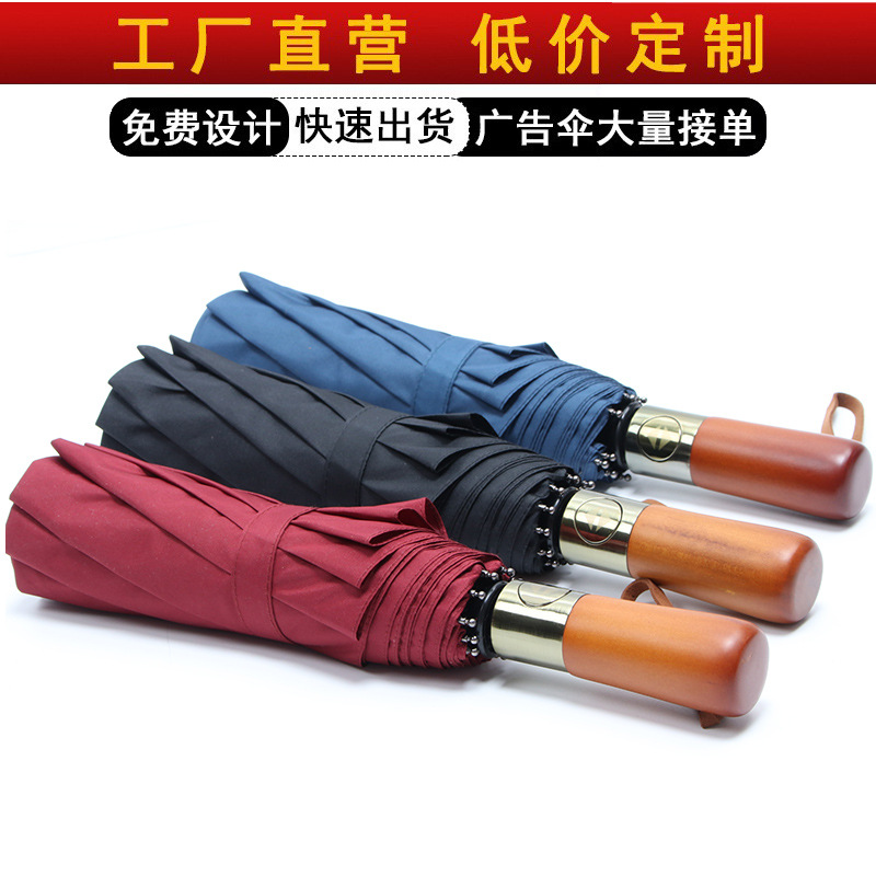 厂家直销复古木手柄全自动雨伞特氟龙三折叠晴雨两用广告伞