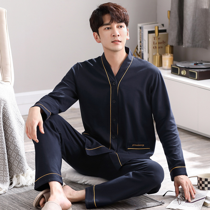 봄 가을 남성용 면 긴팔 잠옷 청년 캐주얼 가디건 브이넥 루즈핏 큰 사이즈 가을 홈웨어 세트스토어 가기