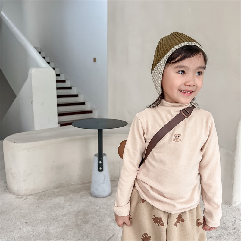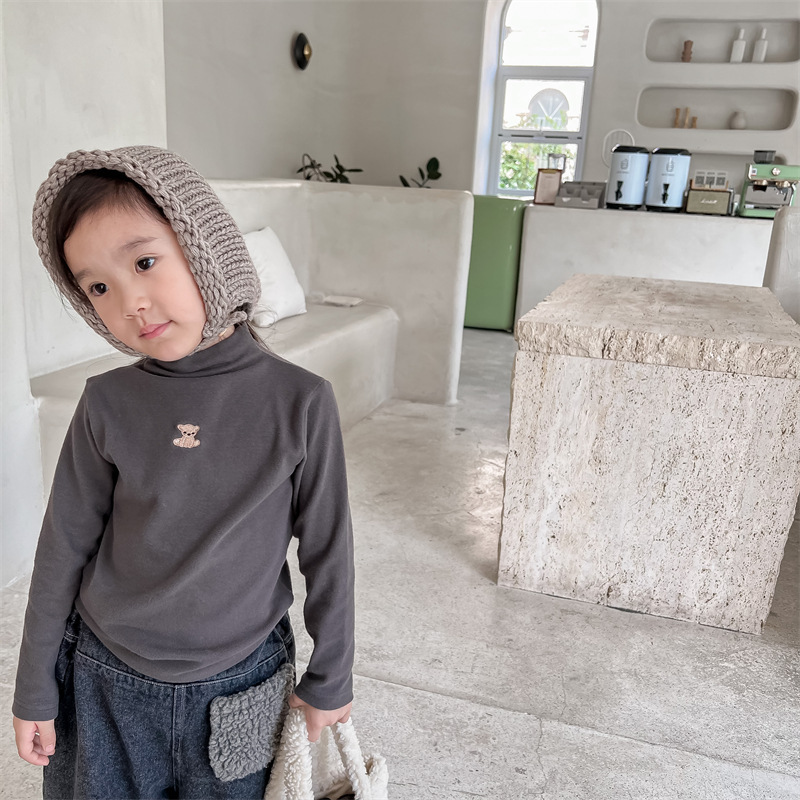 어린이 바닥 셔츠 2023 가을과 겨울 소년과 소녀 곰 자수 세미 하이 칼라 울 풀 스탠드 따뜻한 긴 소매 바닥 셔츠