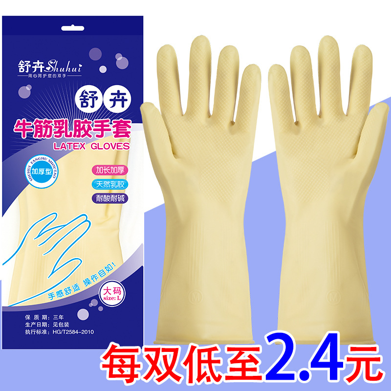 두꺼운 Shuhui 브랜드 쇠고기 힘줄 라텍스 장갑 고무 접시 세척 가사 청소 방수 고무 노동 보호 플라스틱 산 및 알칼리 내성
