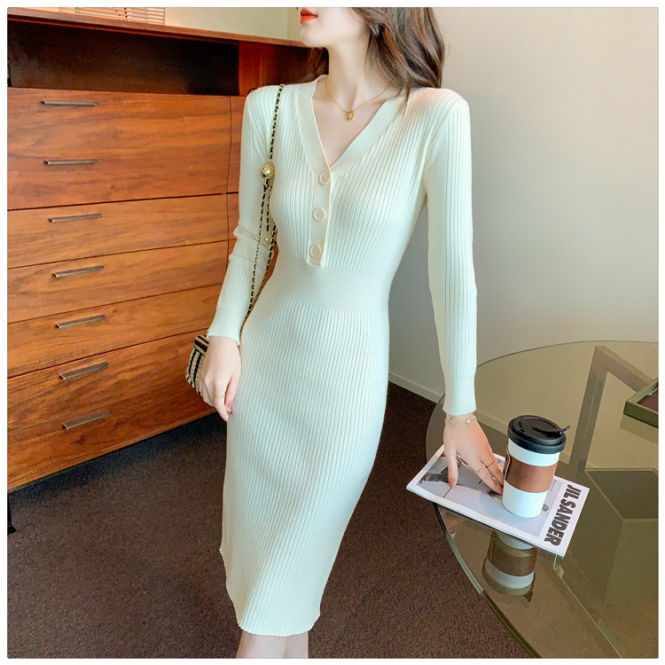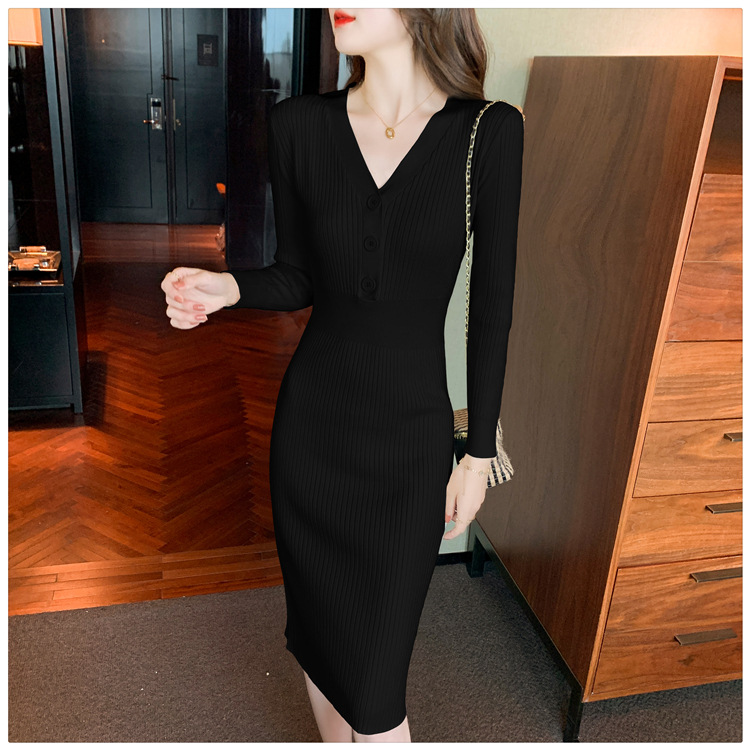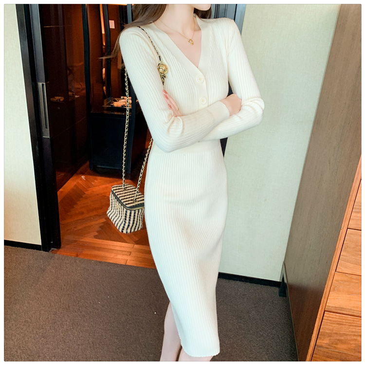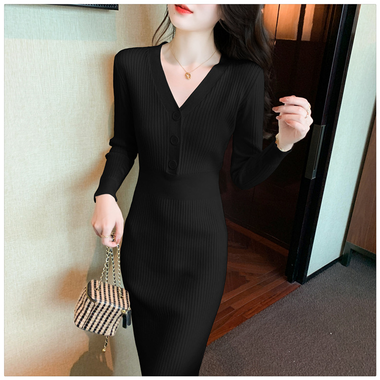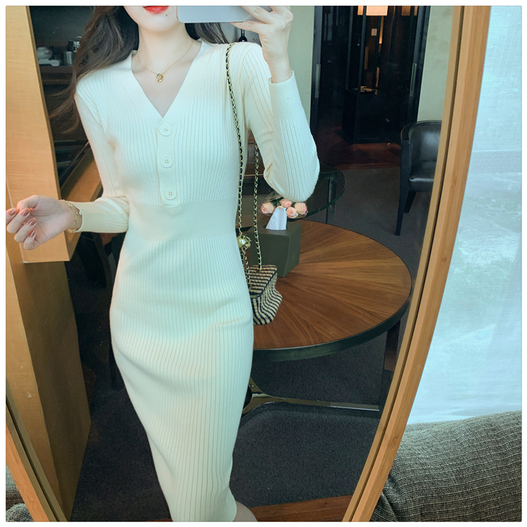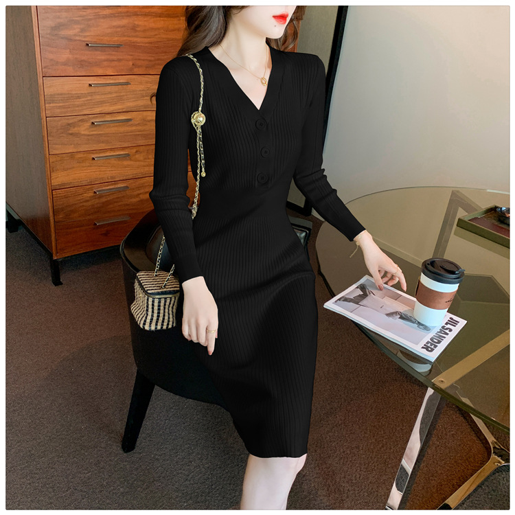 니트 원피스 여성의 가을과 겨울 새로운 V-넥 중간 길이 오버 더-무릎 내복 연령 감소 스커트 슬림 핏 스커트 도매스토어 가기