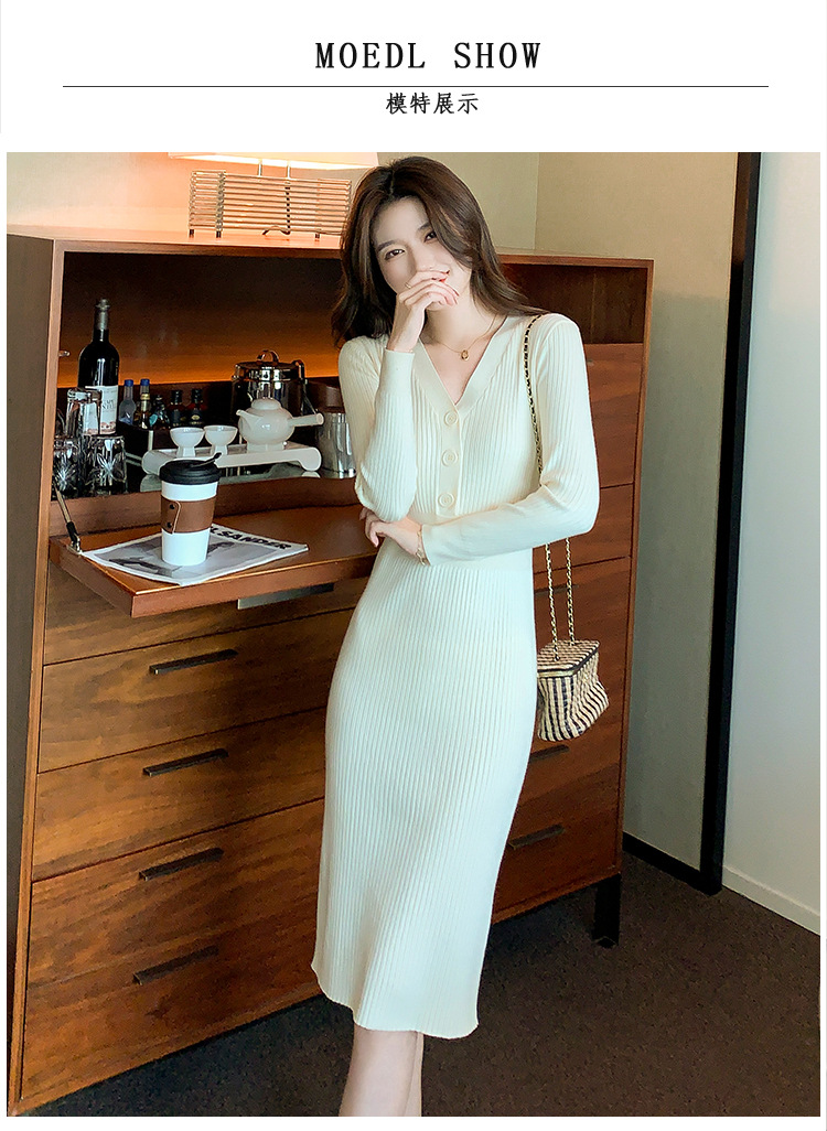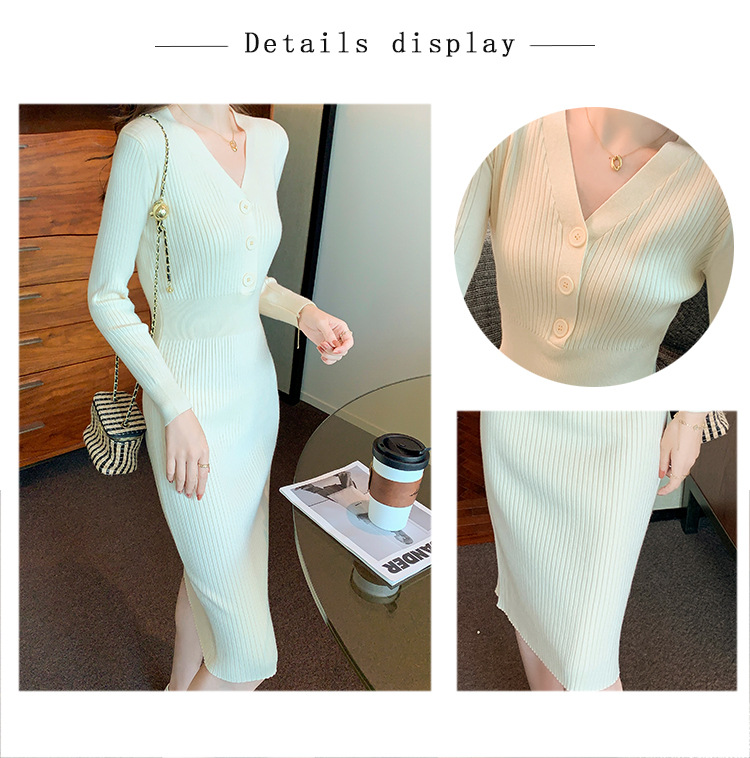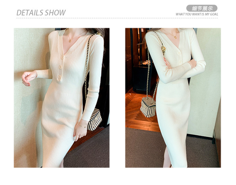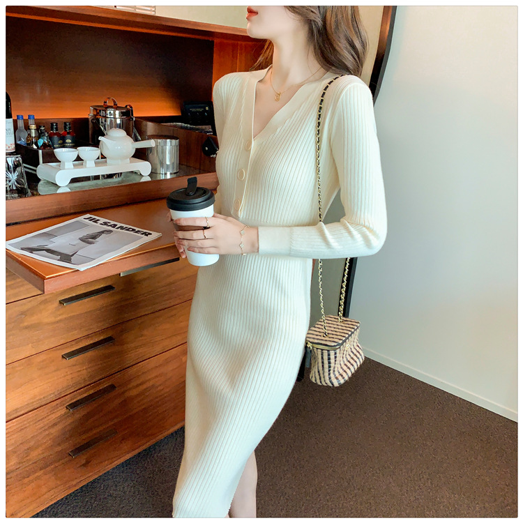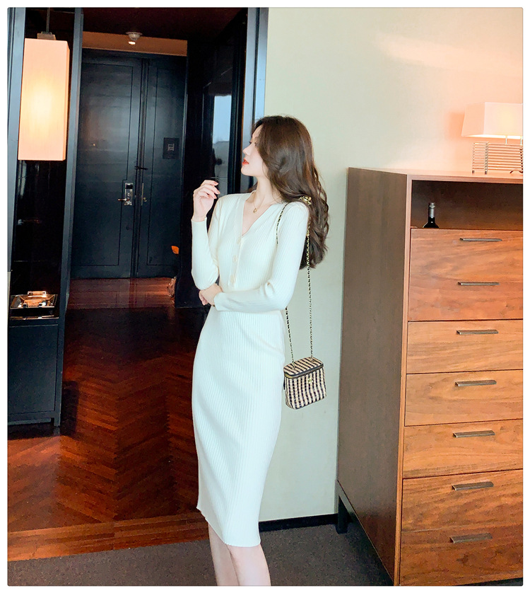 니트 원피스 여성의 가을과 겨울 새로운 V-넥 중간 길이 오버 더-무릎 내복 연령 감소 스커트 슬림 핏 스커트 도매스토어 가기