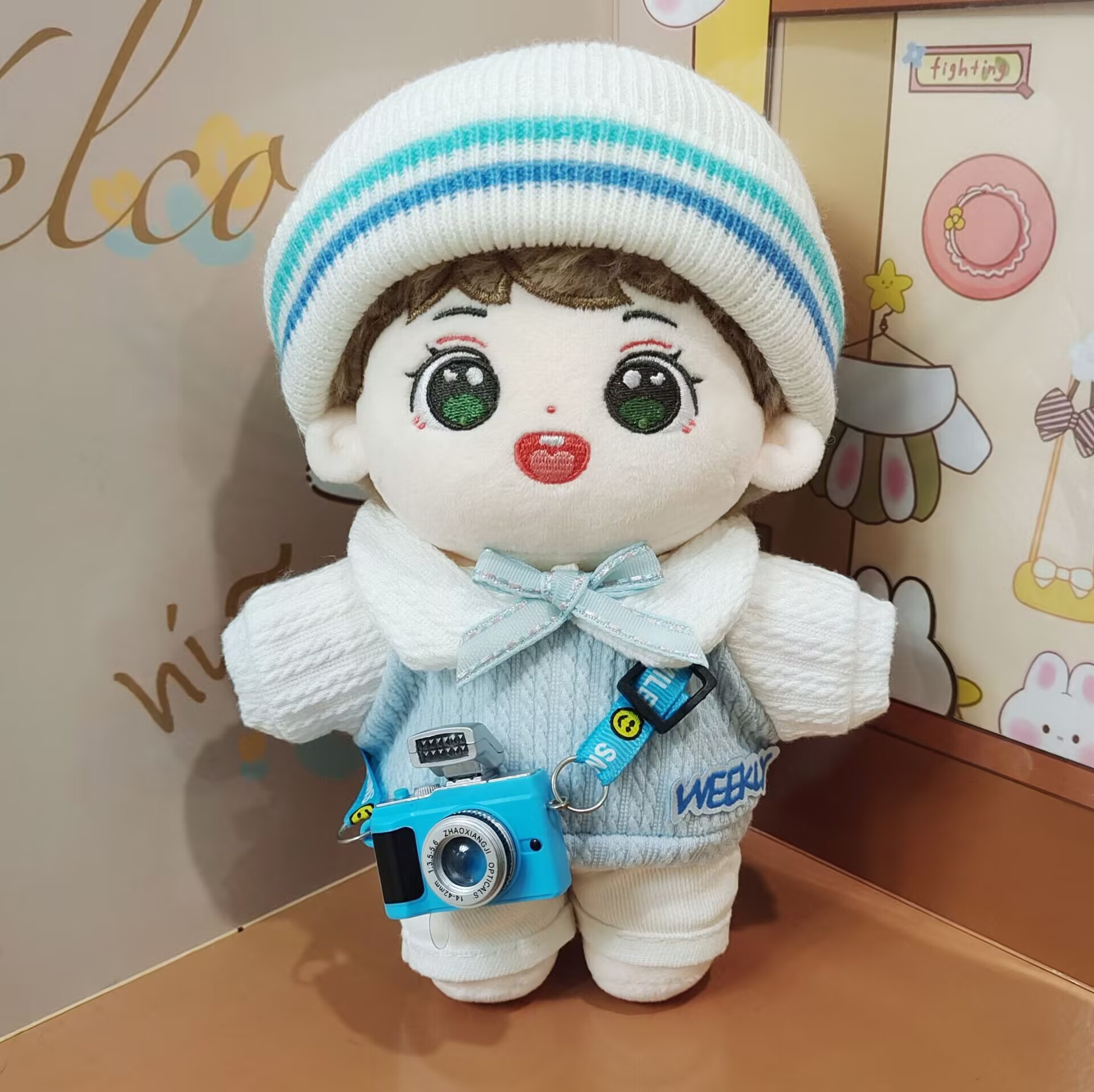 • Yuanbao + 파란색 나비넥타이 스웨트셔츠, 흰색 바지 + 파란색 카메라 파란색과 녹색 모자