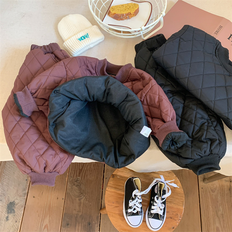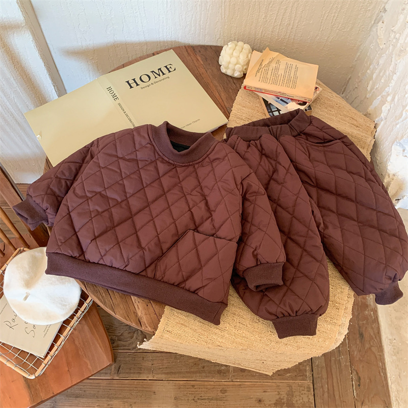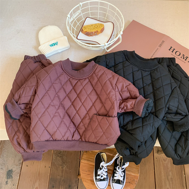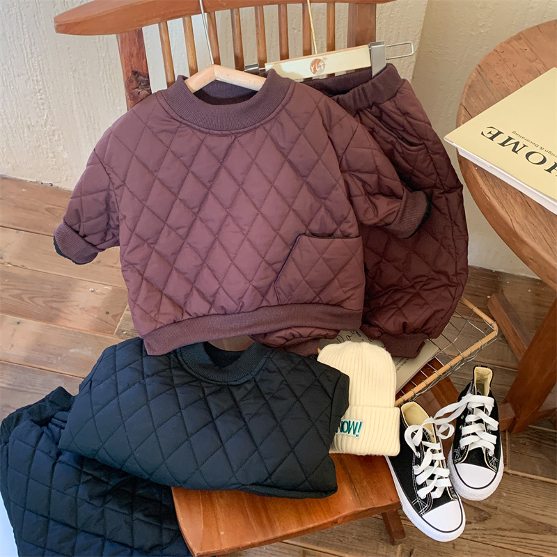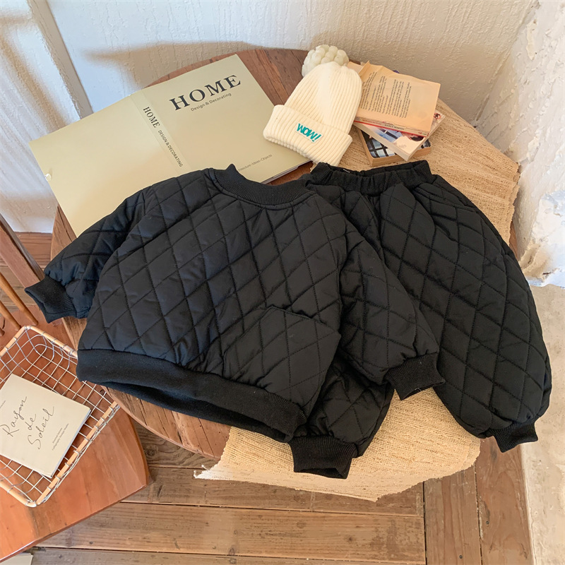 몽테뉴 아동복 소년 소녀 한국식 단색 퀼팅 면 세트 아동용 두꺼운 탑 트렌디 투피스 팬츠 세트