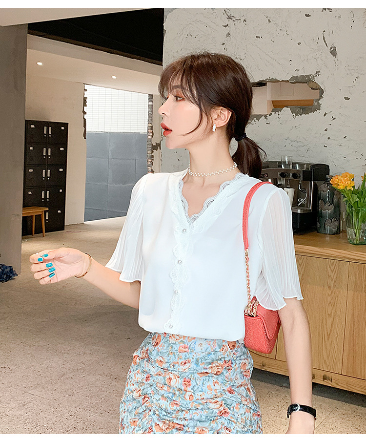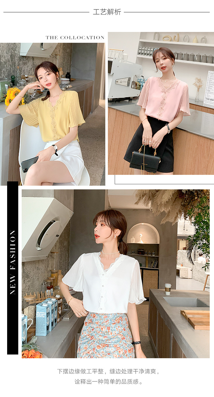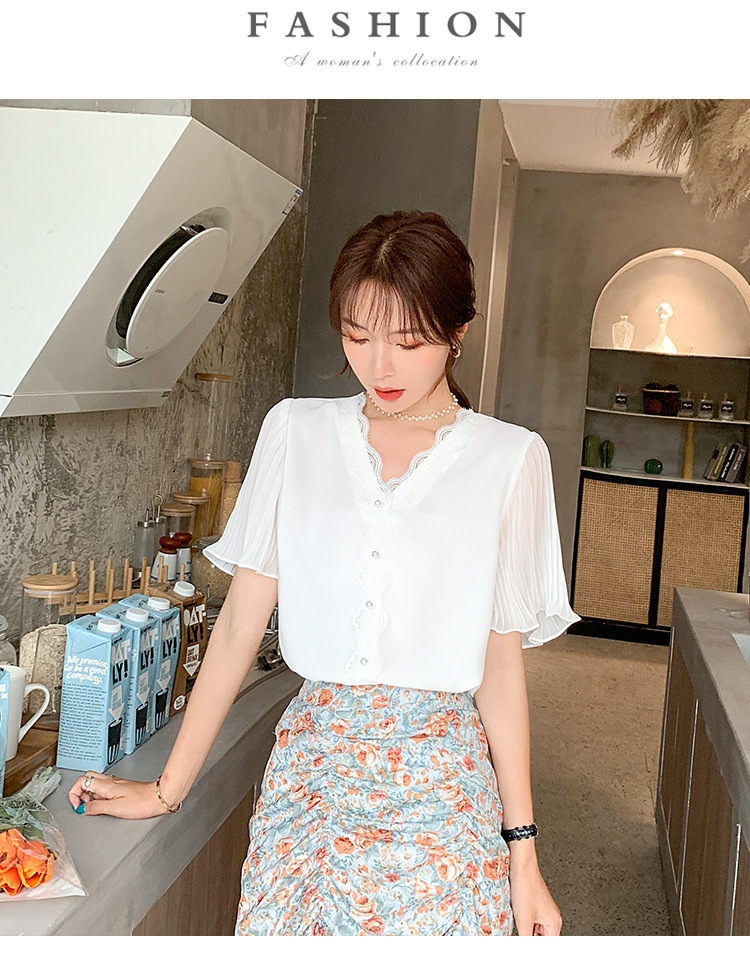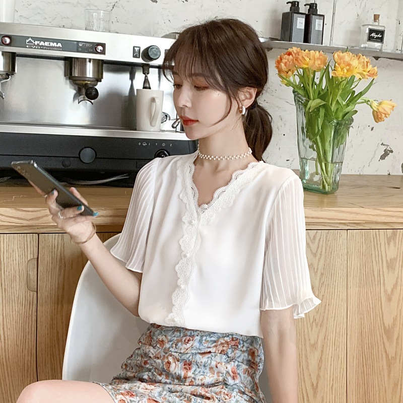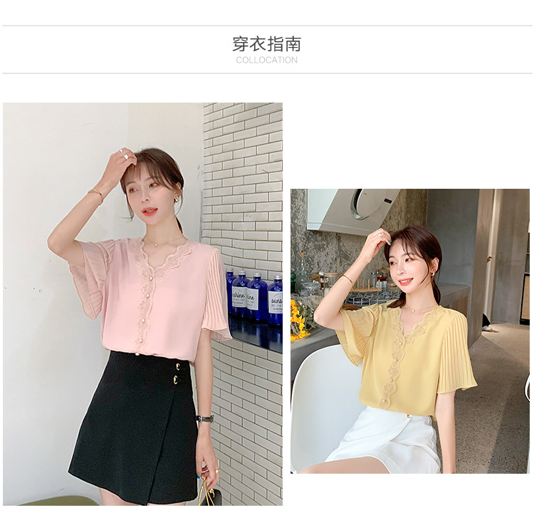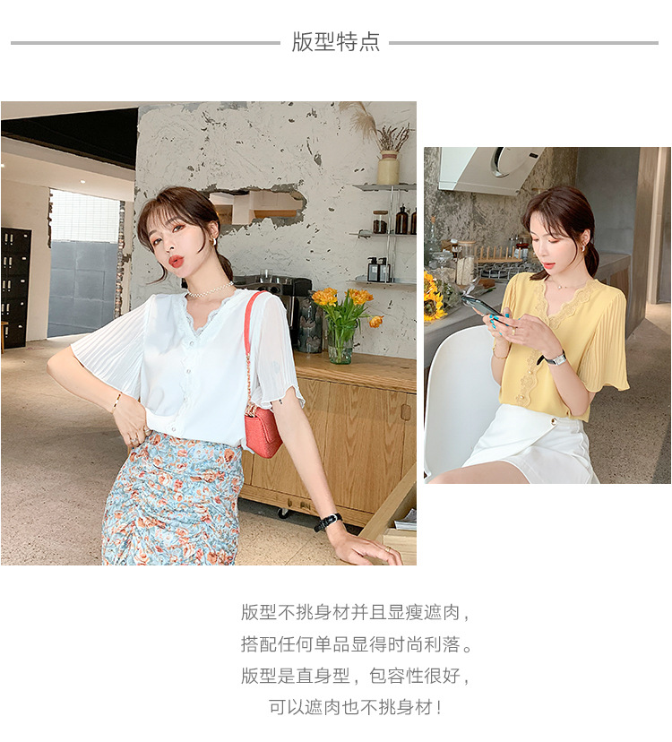 반팔 여성의 2022 여름 새 쉬폰 셔츠 플러스 사이즈 벨 소매 레이스 셔츠 V-넥 탑 세련된 작은 셔츠스토어 가기