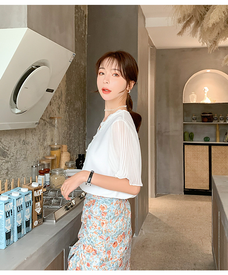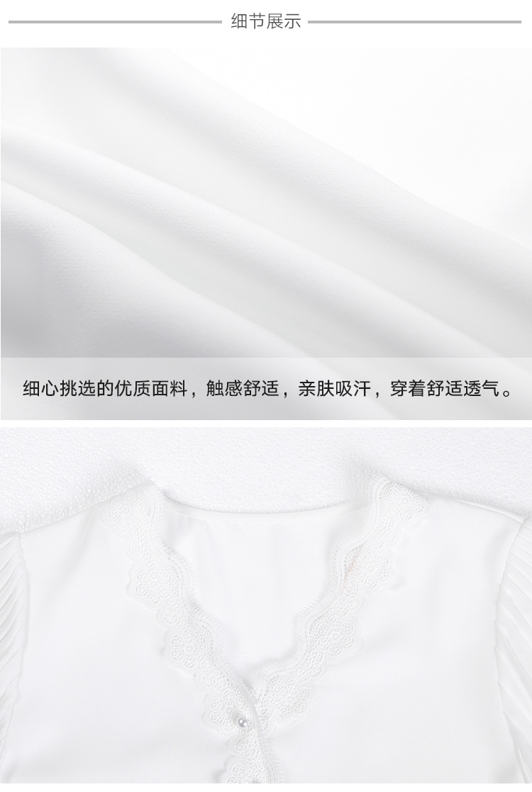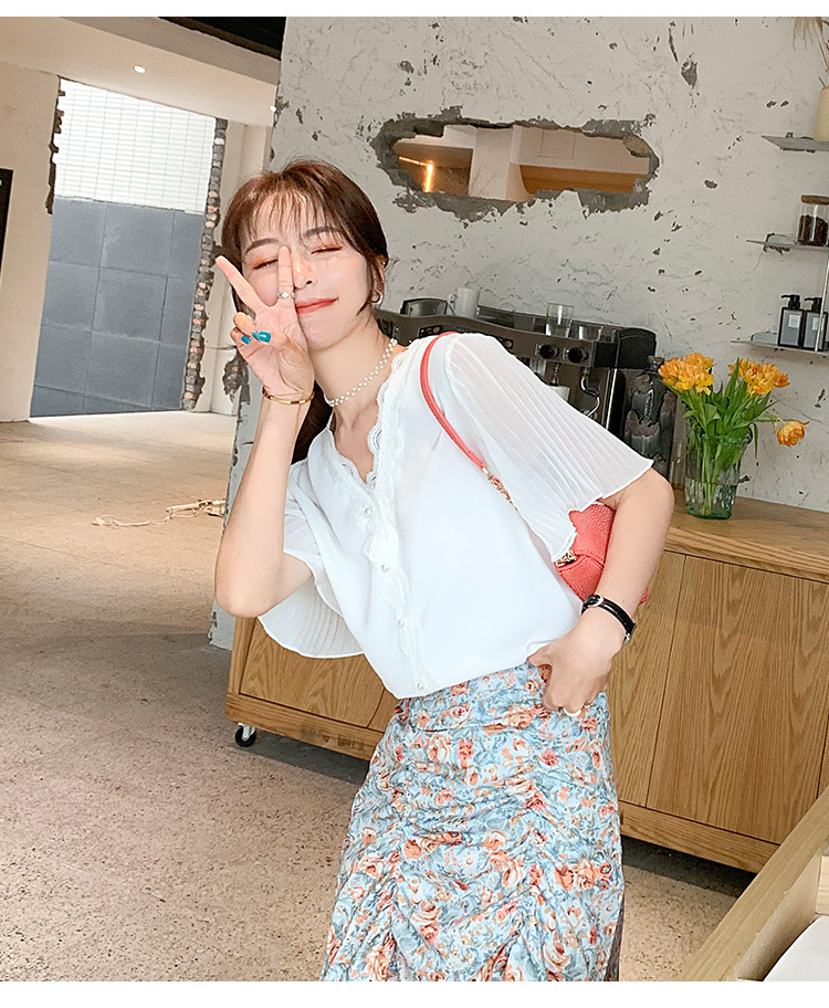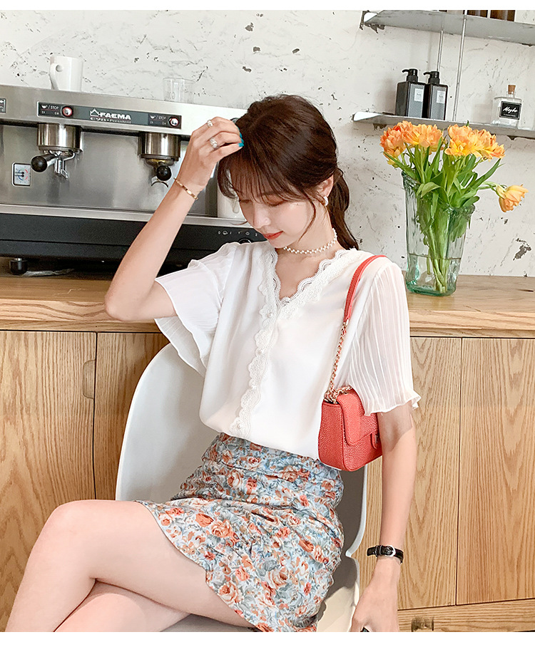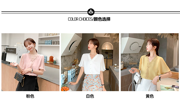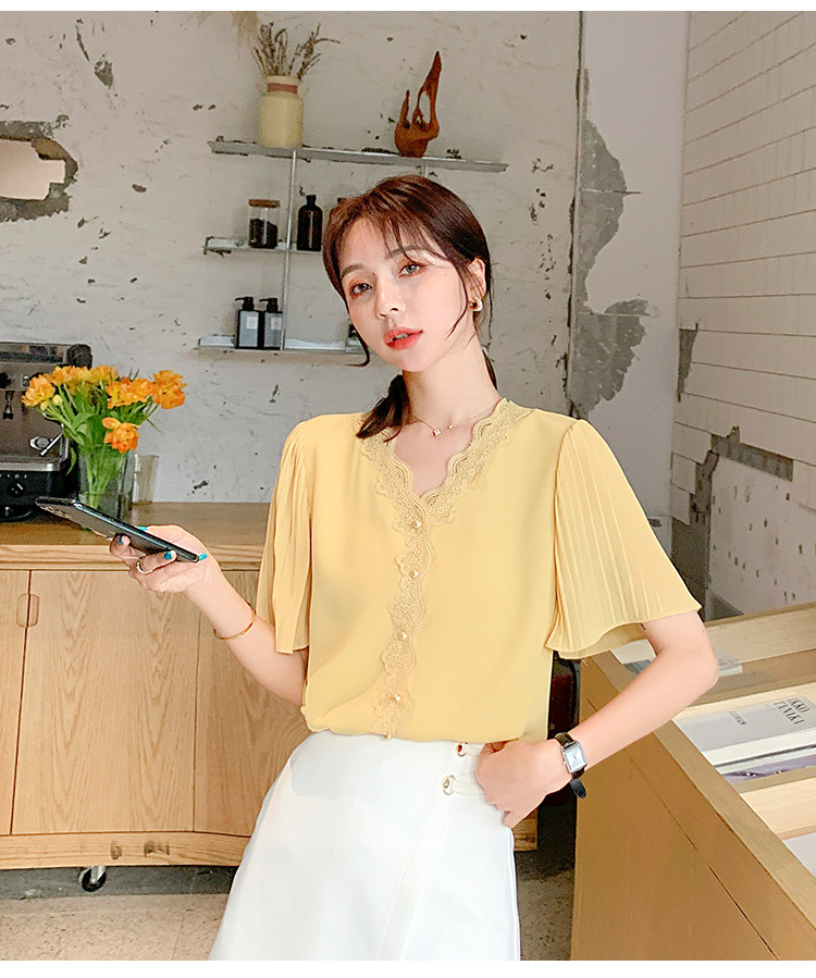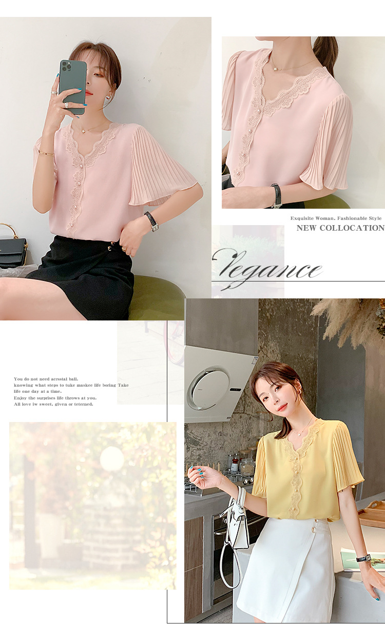 반팔 여성의 2022 여름 새 쉬폰 셔츠 플러스 사이즈 벨 소매 레이스 셔츠 V-넥 탑 세련된 작은 셔츠스토어 가기