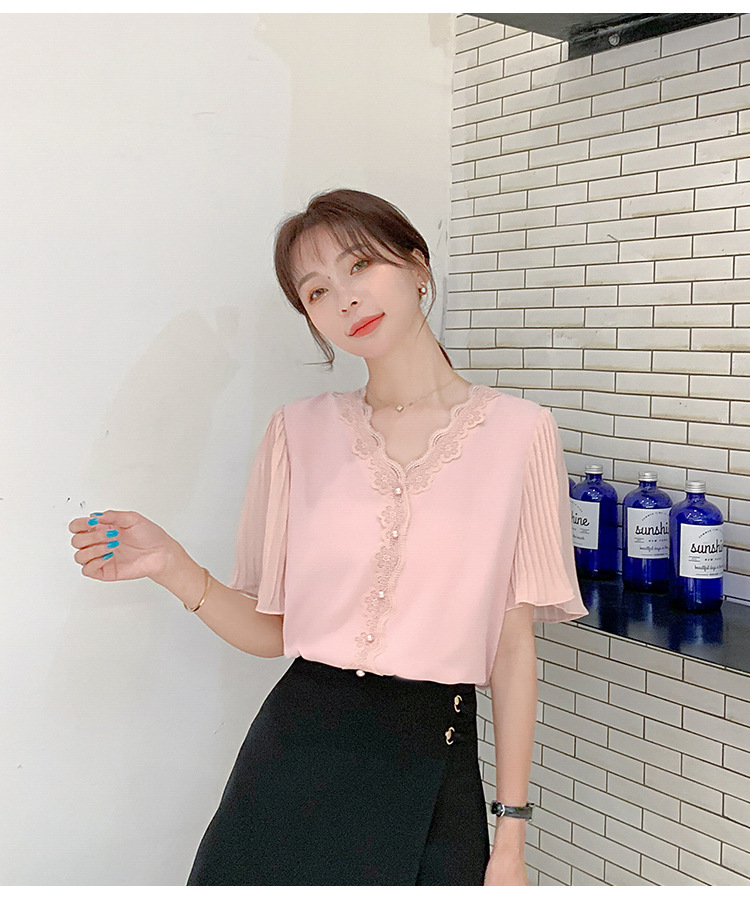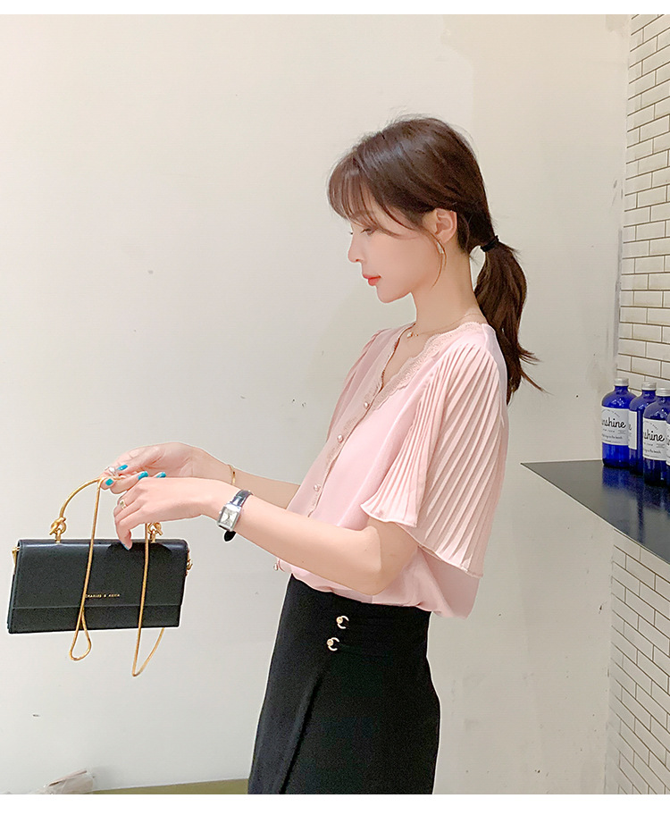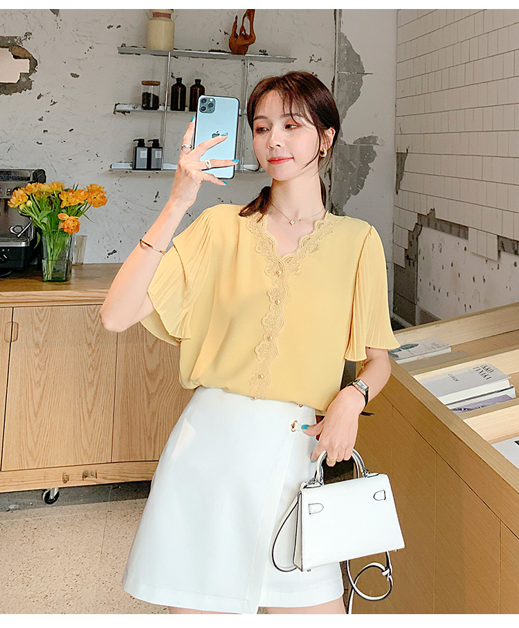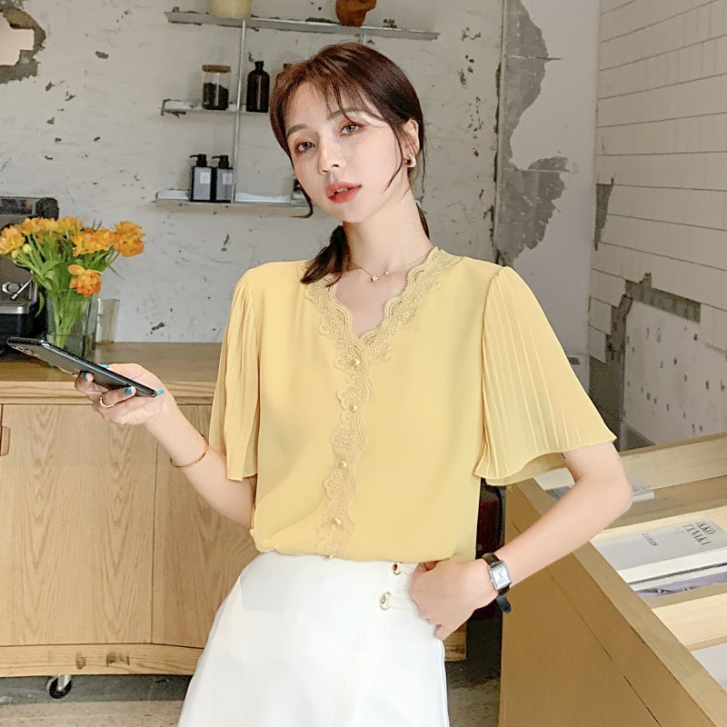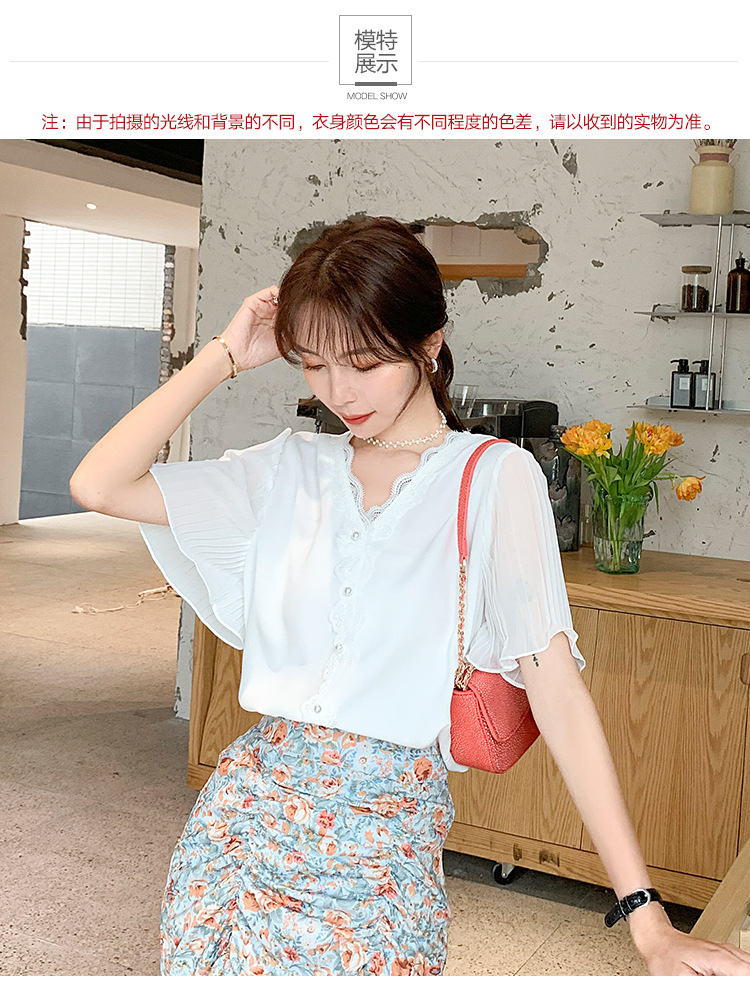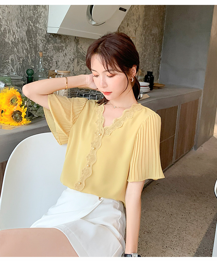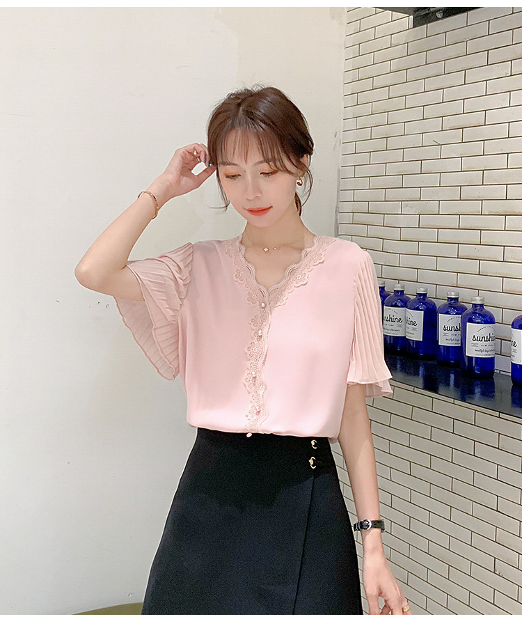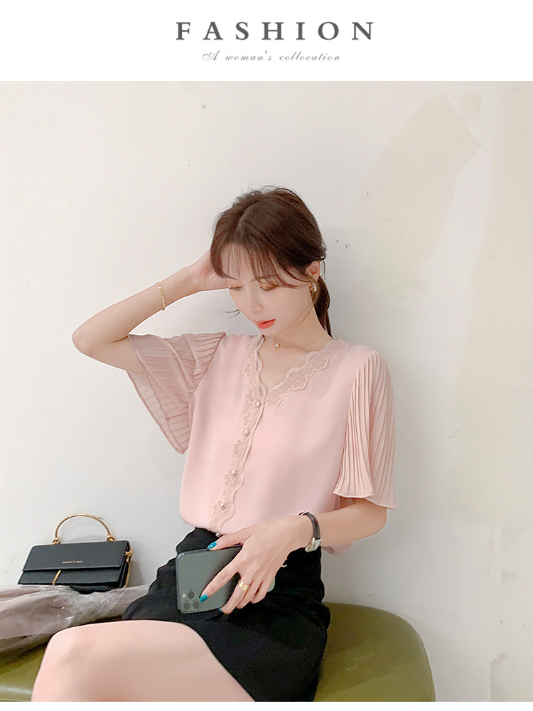 반팔 여성의 2022 여름 새 쉬폰 셔츠 플러스 사이즈 벨 소매 레이스 셔츠 V-넥 탑 세련된 작은 셔츠