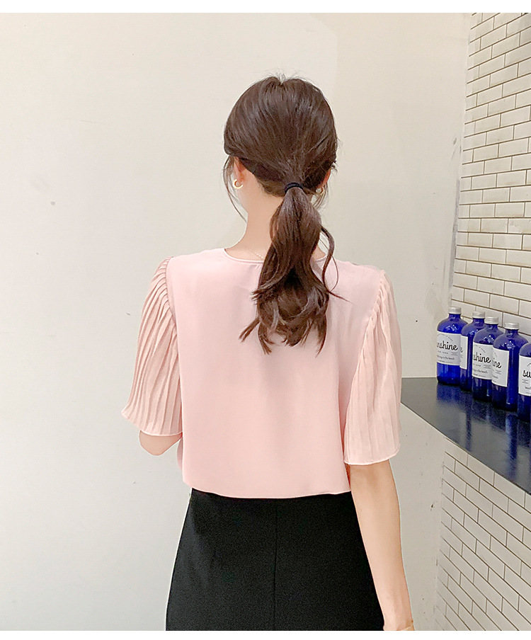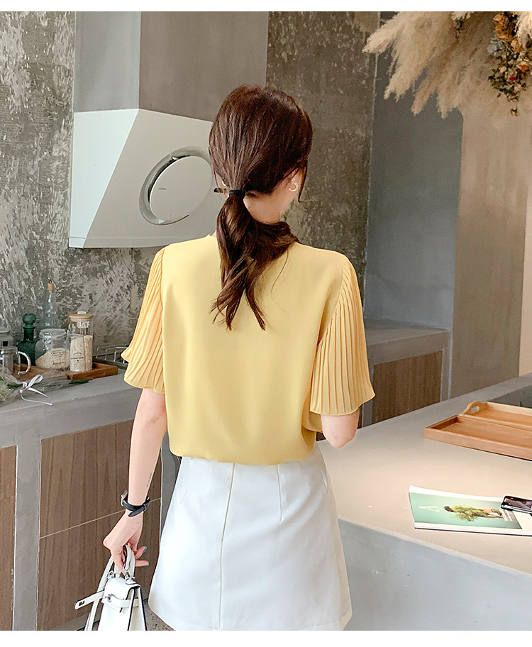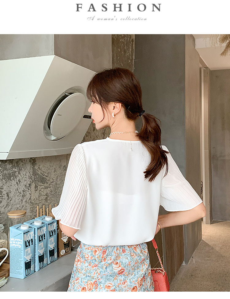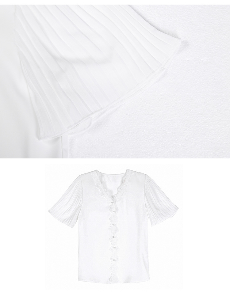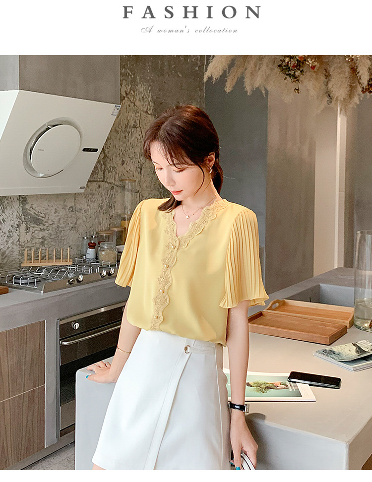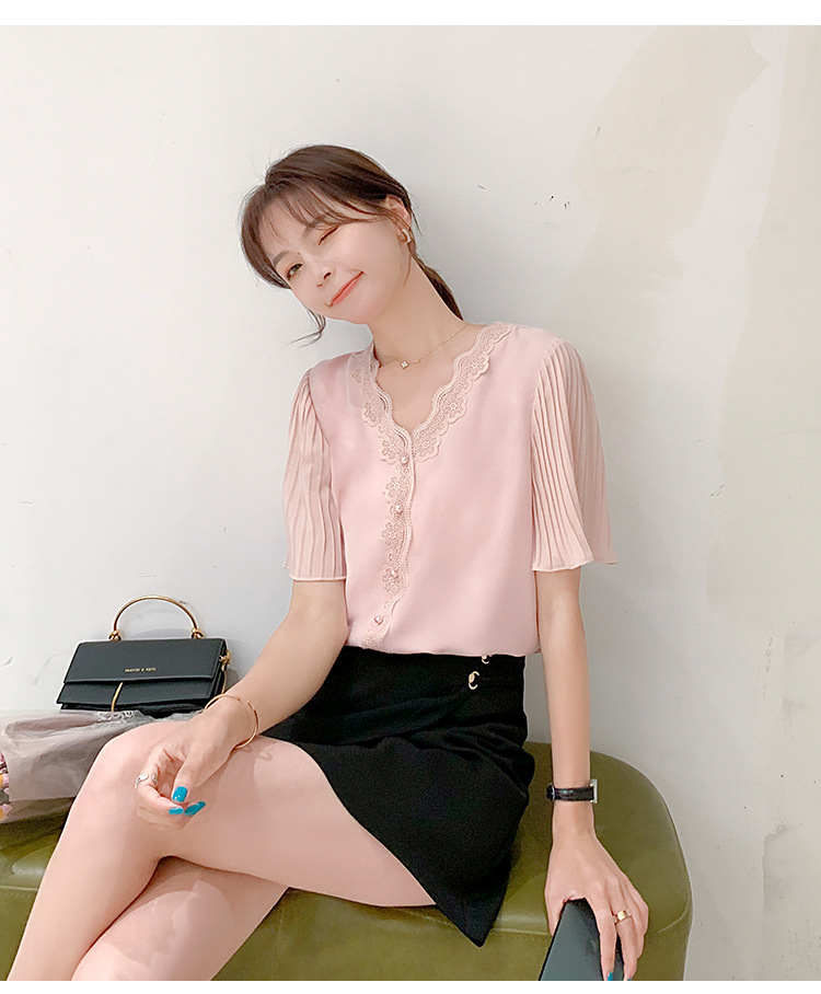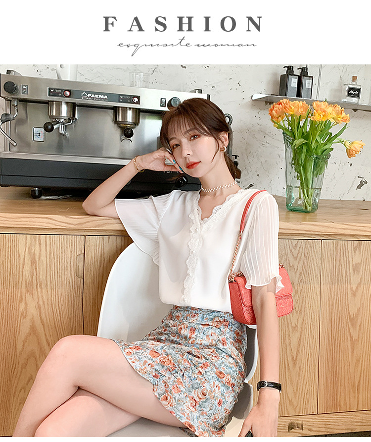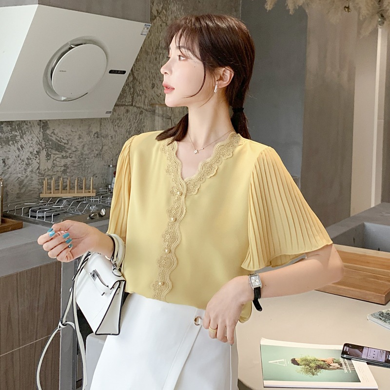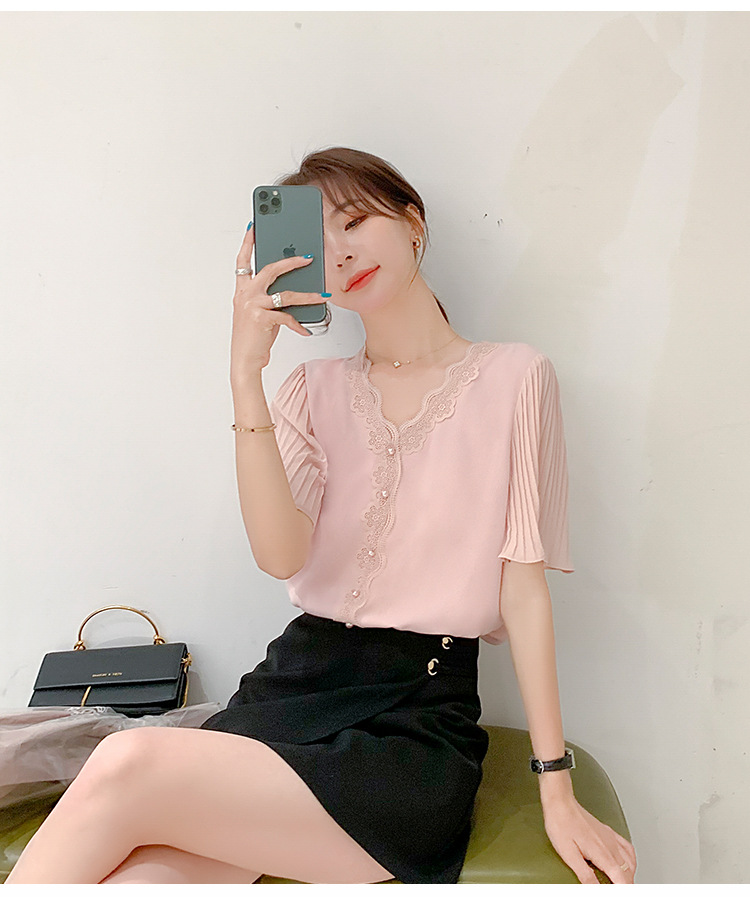 반팔 여성의 2022 여름 새 쉬폰 셔츠 플러스 사이즈 벨 소매 레이스 셔츠 V-넥 탑 세련된 작은 셔츠