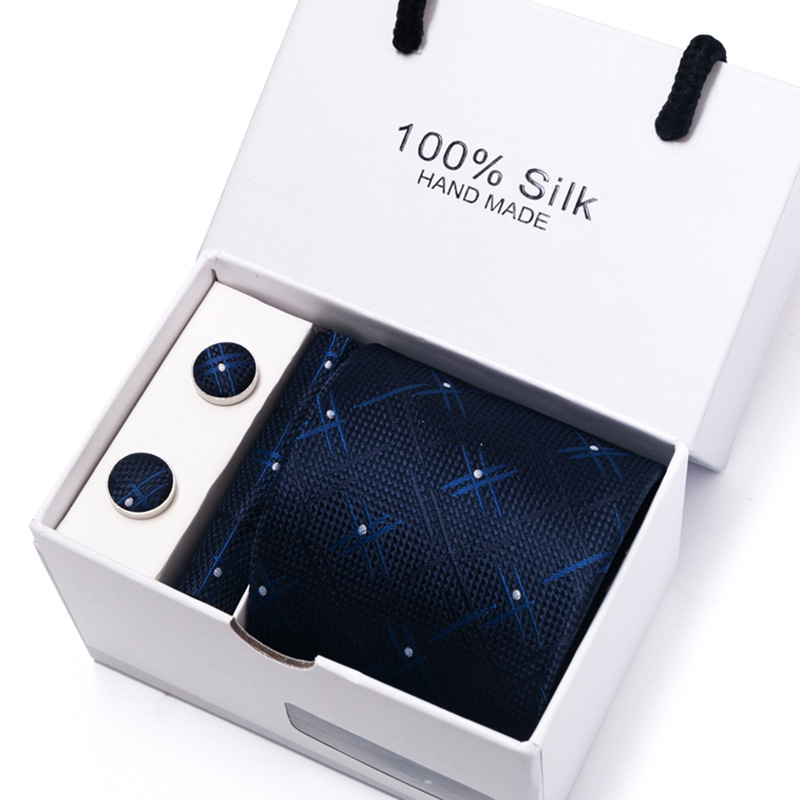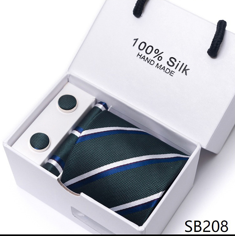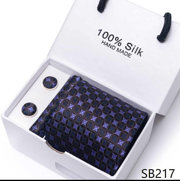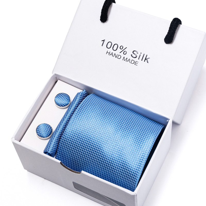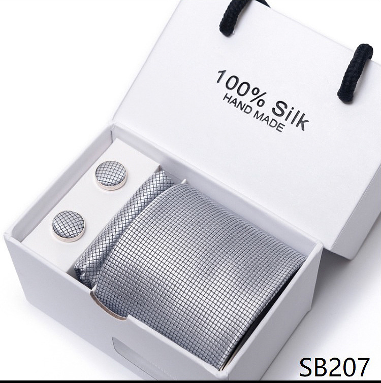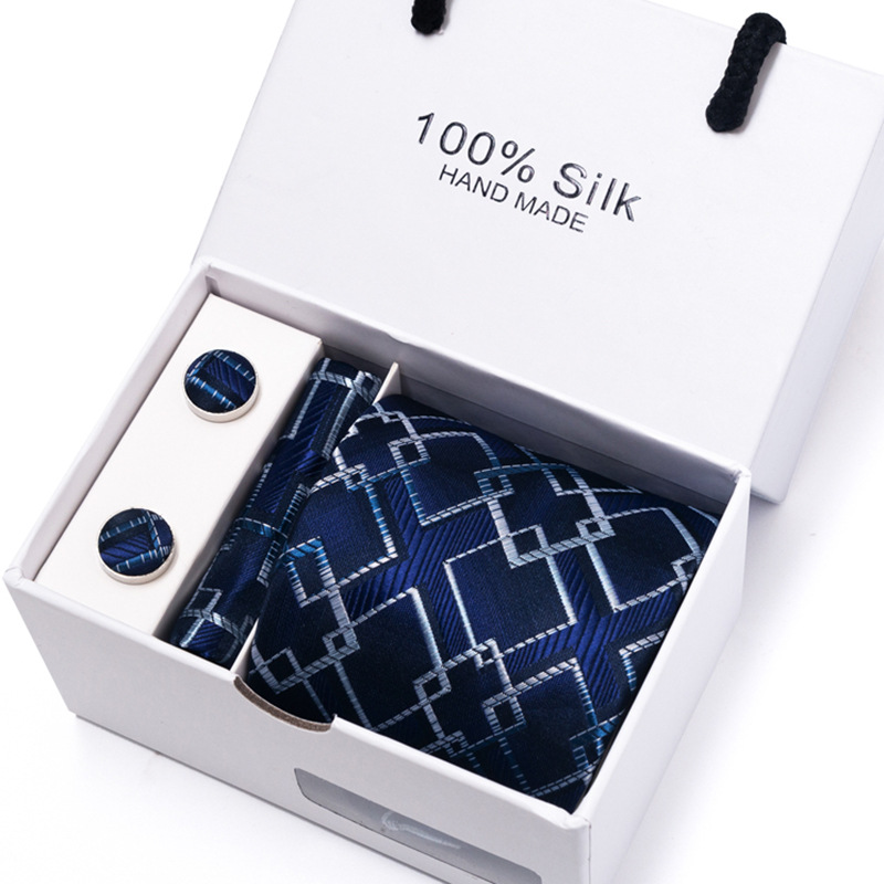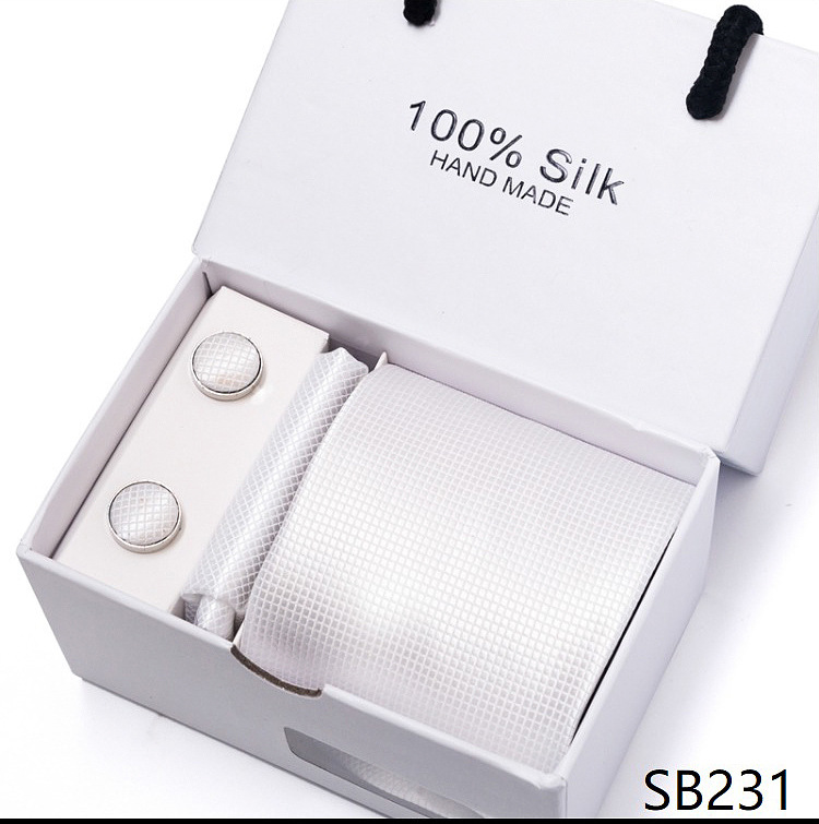 套装包含领带,方巾,袖扣,领带夹,白色礼盒