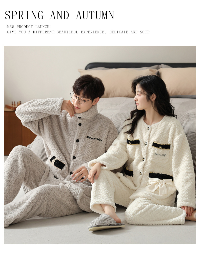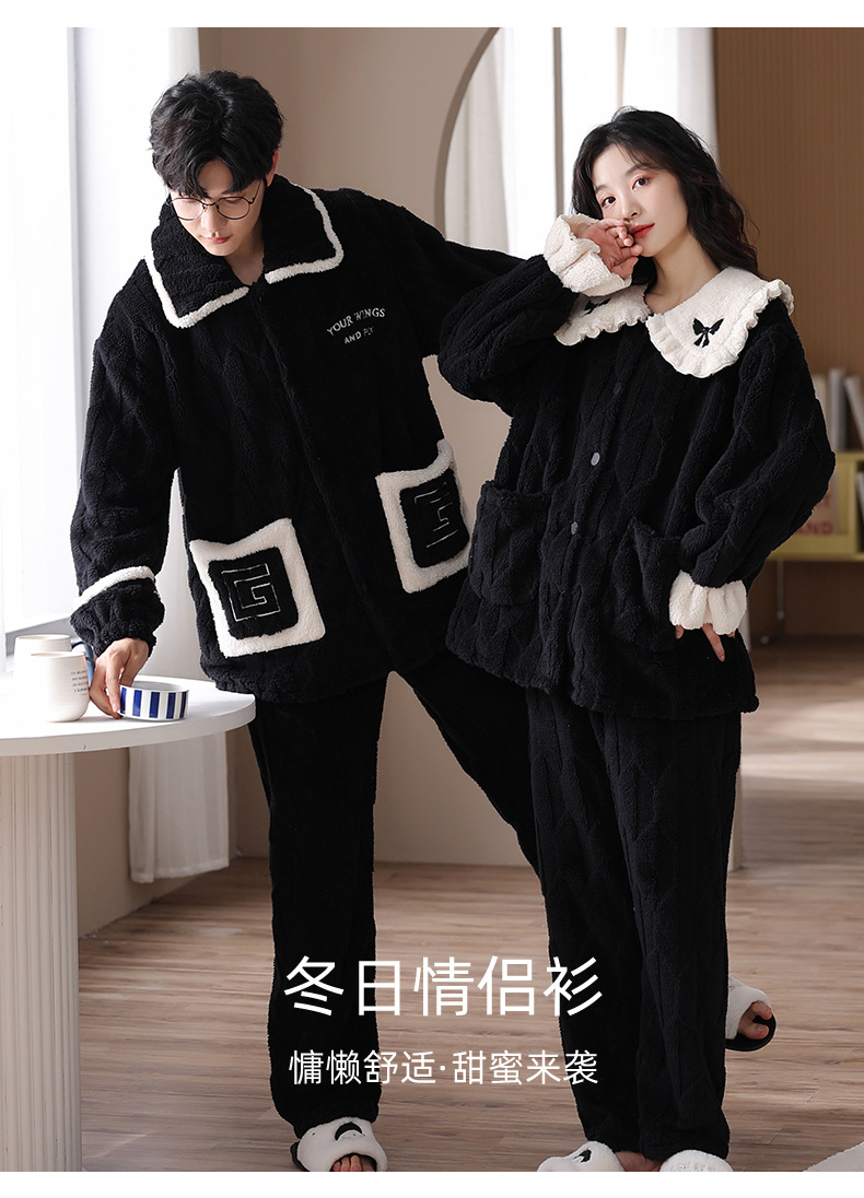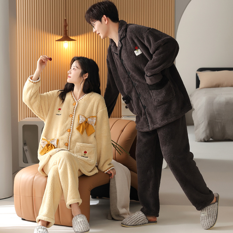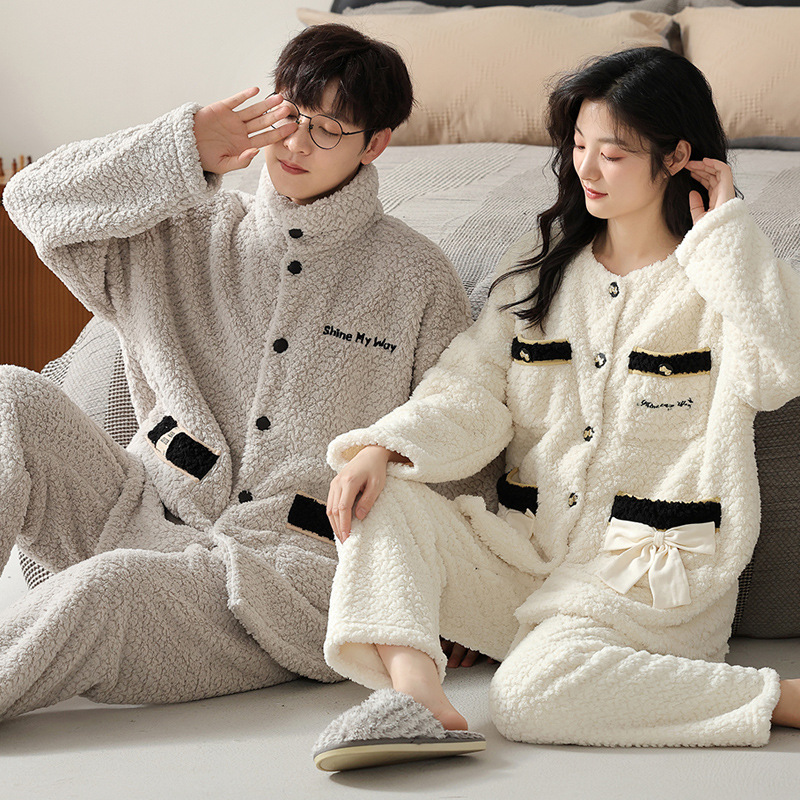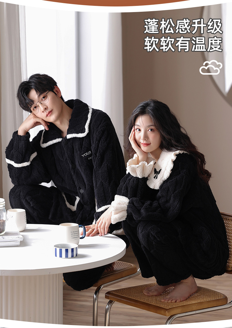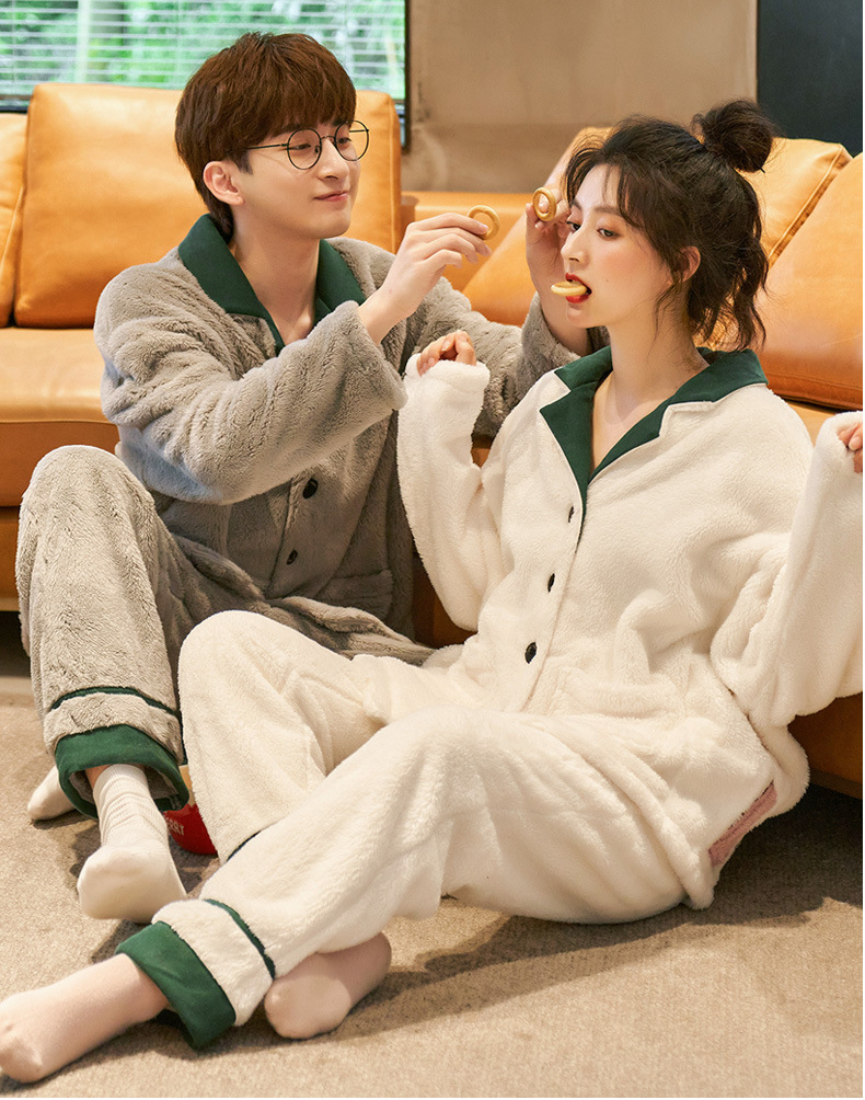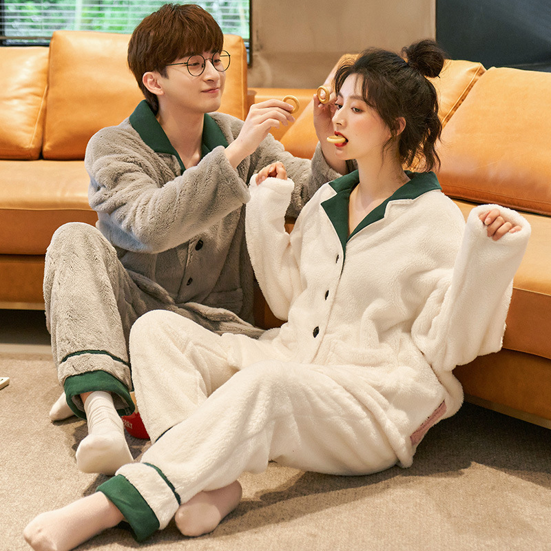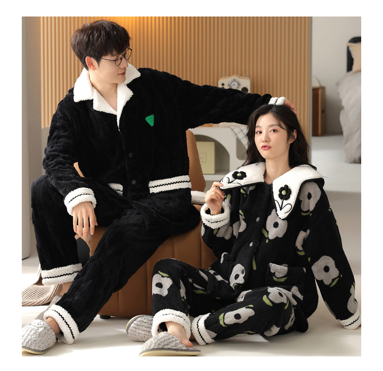 플란넬 잠옷 여자의 겨울 따뜻한 기모 두꺼운 투피스 세트 여자의 산호 양털 아웃웨어 커플 잠옷 남성용