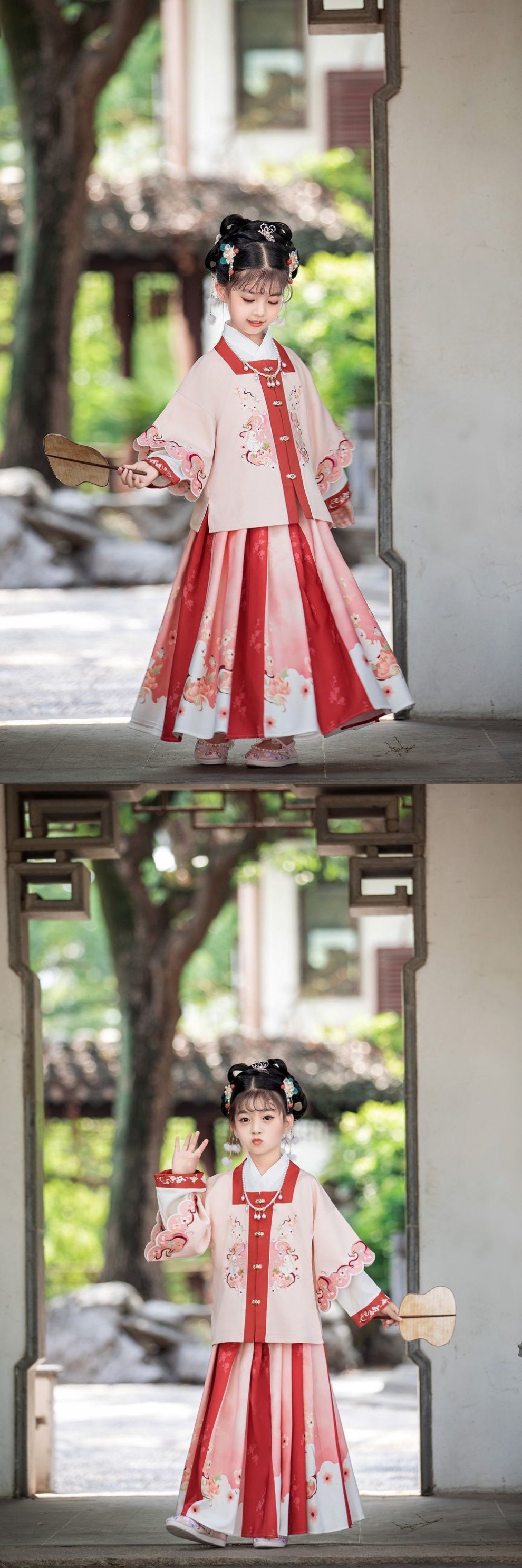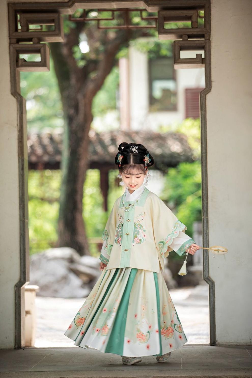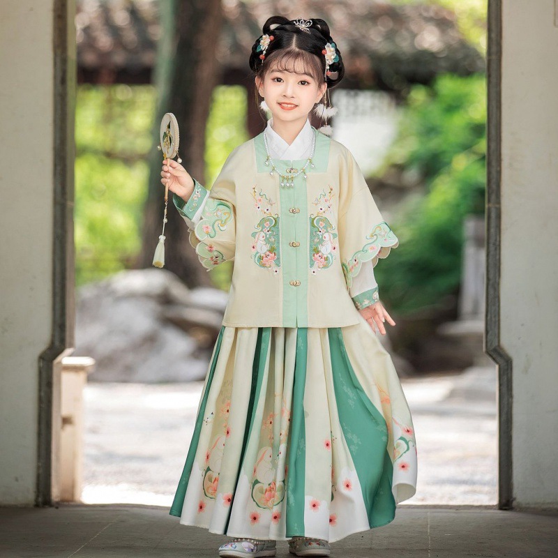 봄과 가을 Hanfu 소녀의 새로운 자수 중국 스타일 어린이의 매일 개선 된 고대 세트 Ming에서 만든 말 얼굴 치마 여자의 보물 당 세트