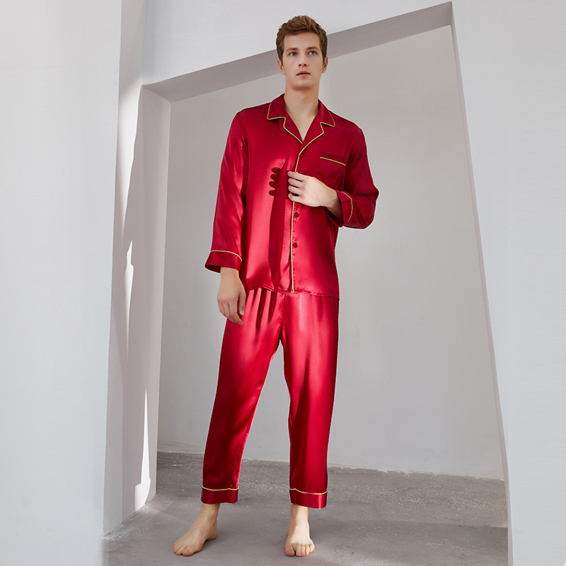 나비 자수 실크 파자마 남자 긴팔 바지 투피스 실크 홈 옷 100% 뽕나무 실크 파자마 세트 남성스토어 가기