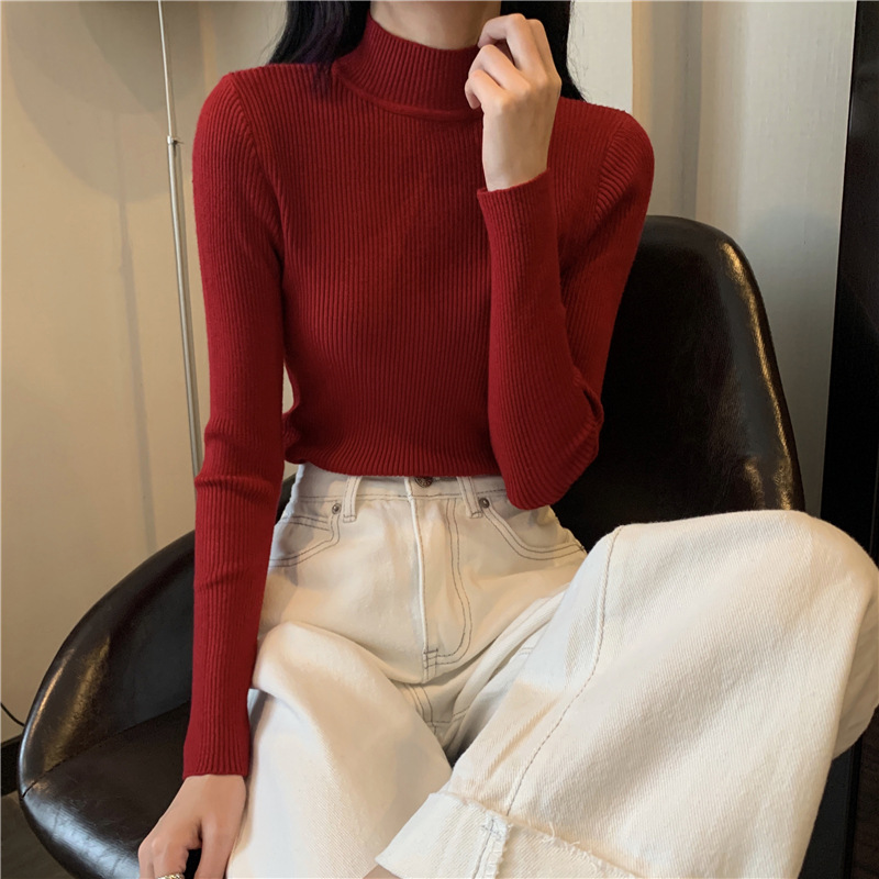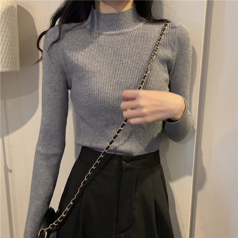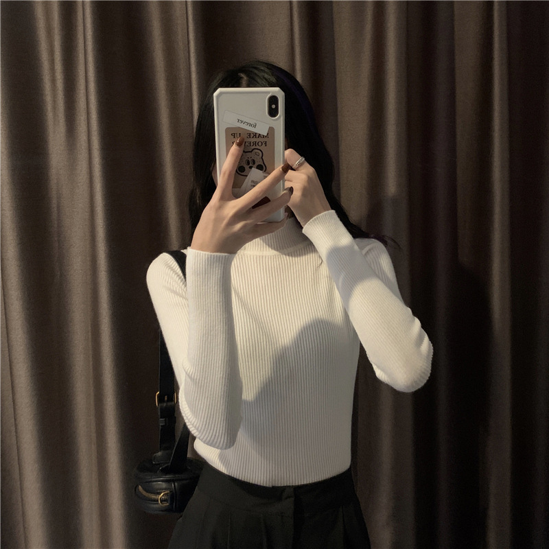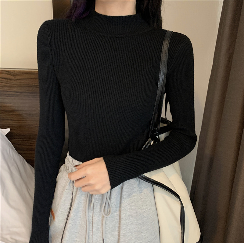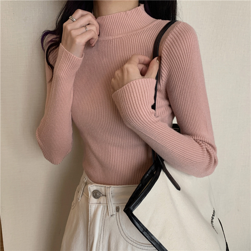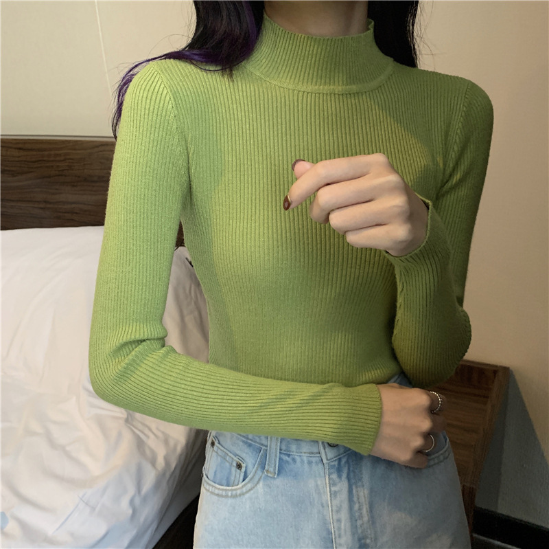가을 2022 새로운 캔디 컬러 세미 하이 칼라 긴 소매 슬림 하의 스웨터 독특한 세련된 작은 탑 여성스토어 가기