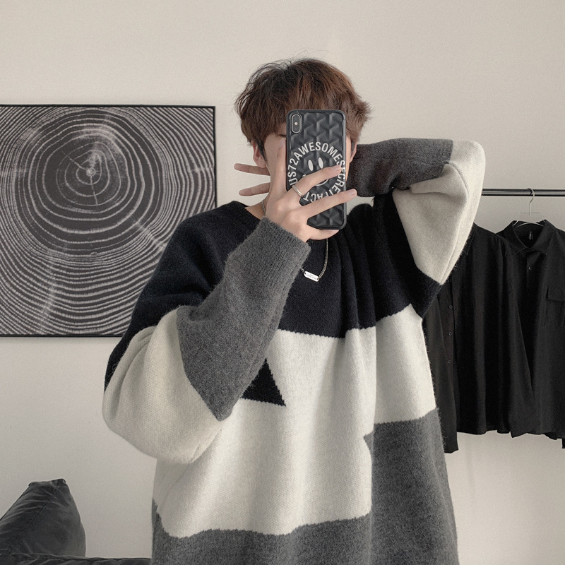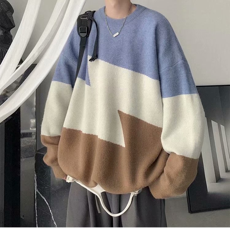 가을과 겨울 두꺼운 남성 패션 in 홍콩 스타일 대비 색상 두꺼운 스웨터 남성용 한국 스타일 패션 스티칭 니트웨어 재킷스토어 가기