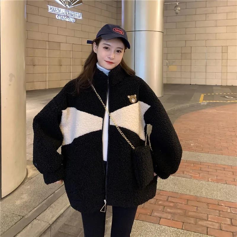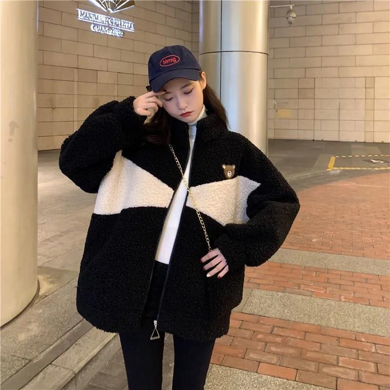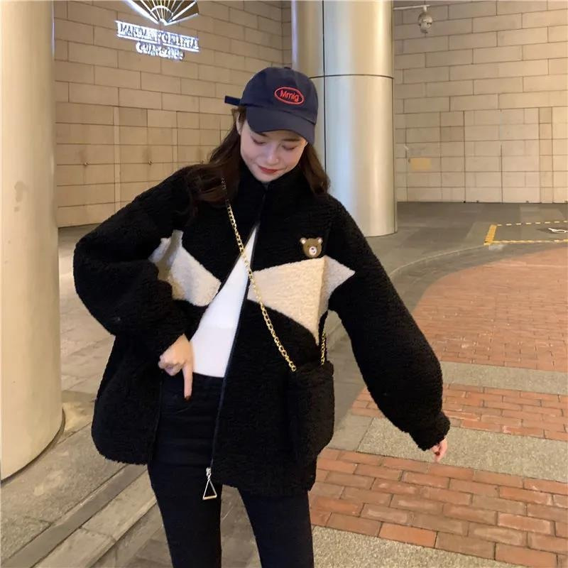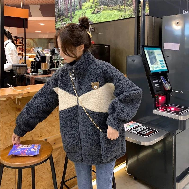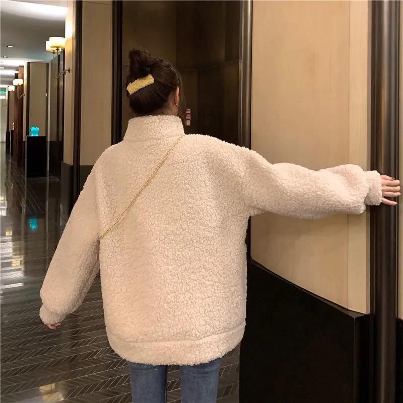 모조 양고기 울 기모 두꺼운 면 패딩 재킷 여자의 2023 새로운 겨울 느슨한 스탠드 칼라 따뜻한 면 in스토어 가기
