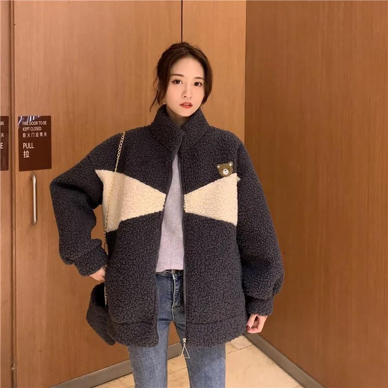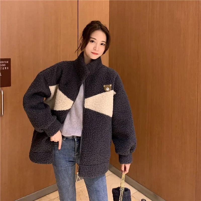 모조 양고기 울 기모 두꺼운 면 패딩 재킷 여자의 2023 새로운 겨울 느슨한 스탠드 칼라 따뜻한 면 in