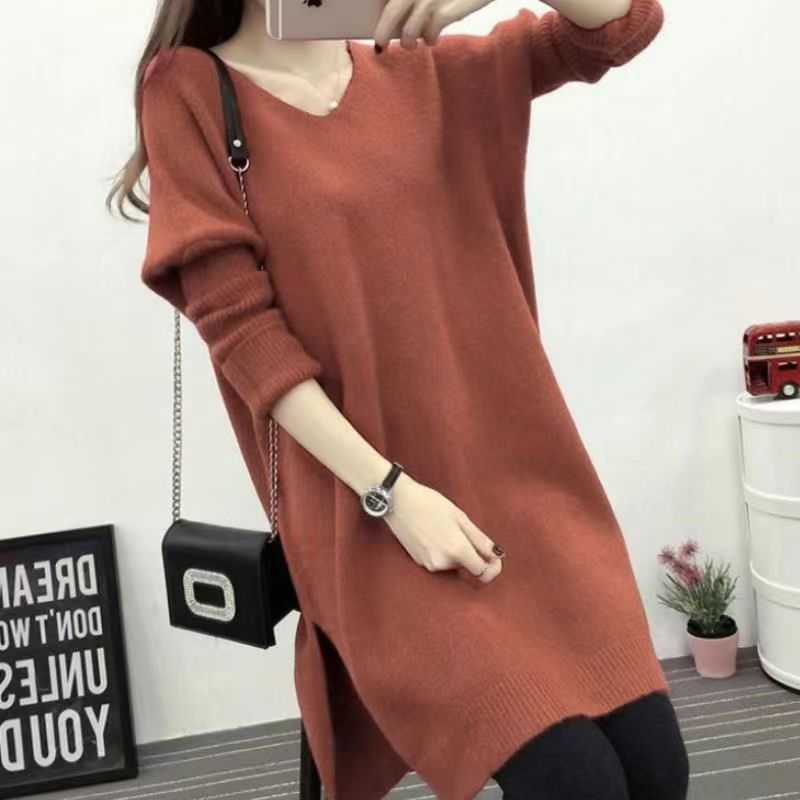 가을과 겨울 박쥐 슬리브 미디 풀오버 V-넥 스플릿 스웨터 여성의 느슨한 니트 스웨터 원피스스토어 가기