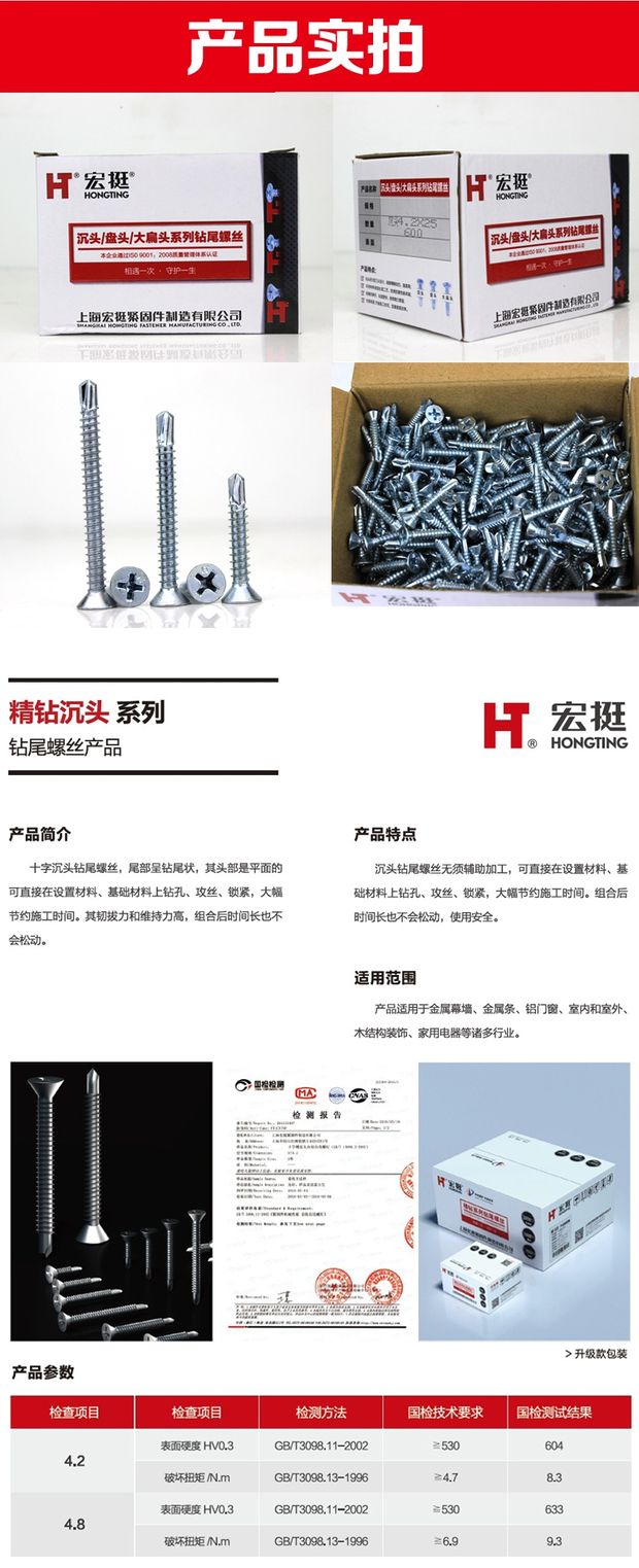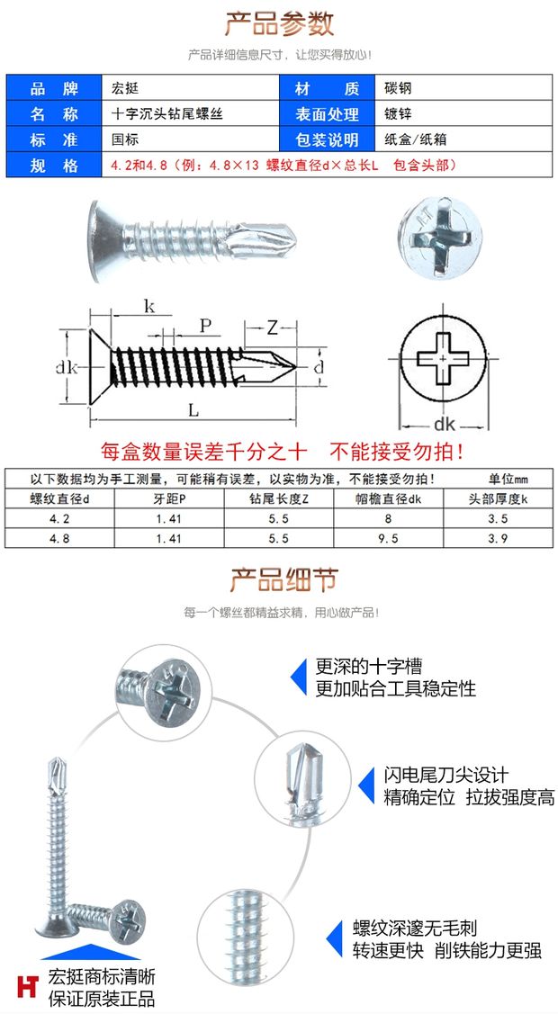 Honging 카운터 싱크 헤드 드릴 테일 스크류 팬 헤드 대형 플랫 헤드 셀프 드릴링 셀프 태핑 더브 테일 와이어 M4.2M4.8/25/32 더브 테일 네일