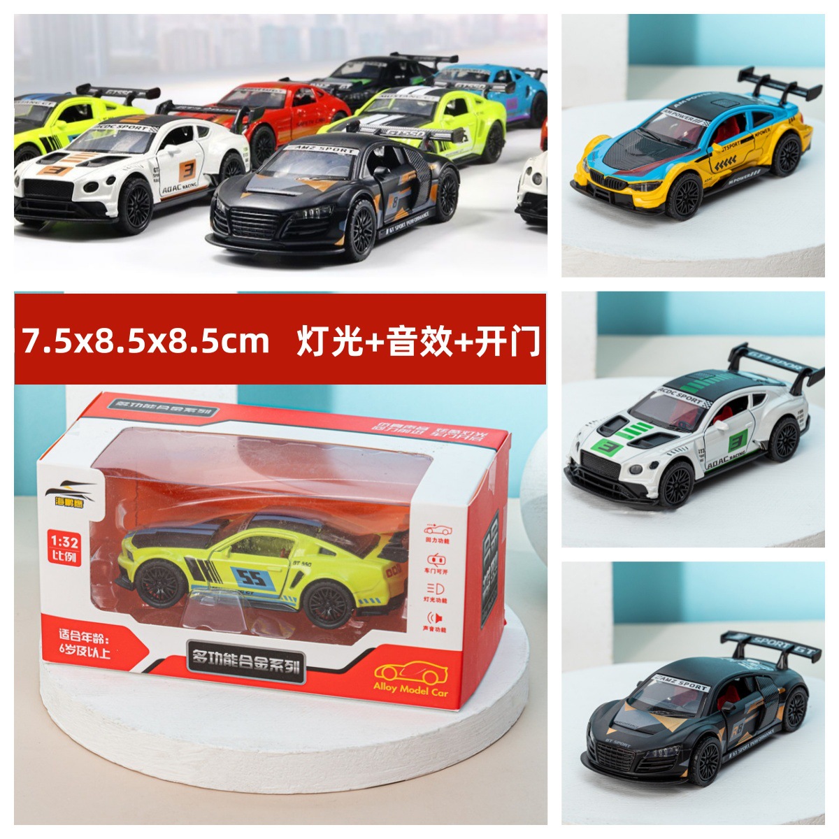 소년용 레이싱 합금 자동차 모델, 문 열림 가능, 어린이용 소리와 조명, 후진 기능 장난감, 장식용 레이싱카스토어 가기