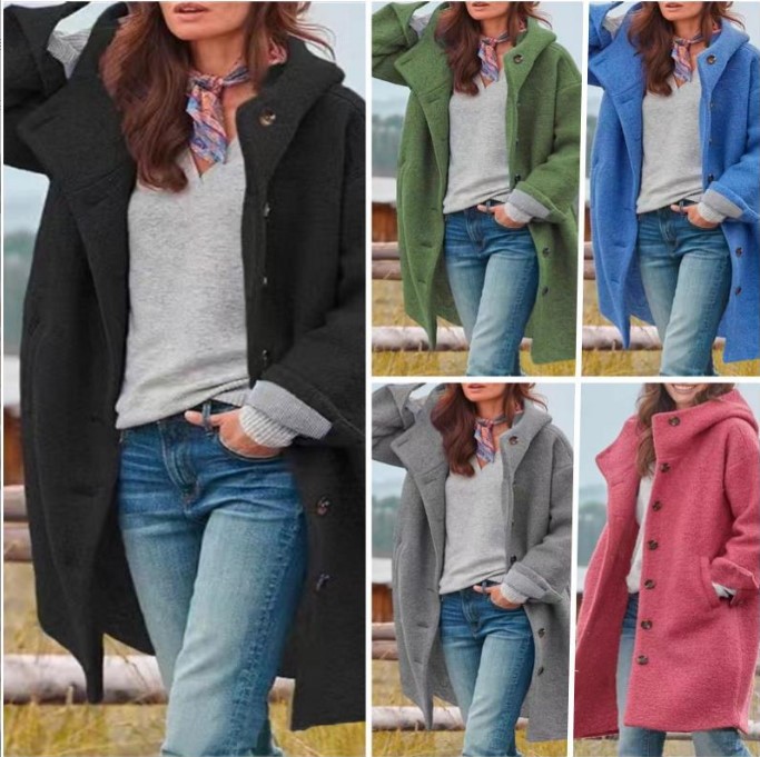 • 跨境爆款欧美秋外贸女装亚马逊长袖翻领外套女士休闲宽松连帽毛呢折扣价:44