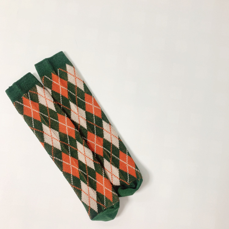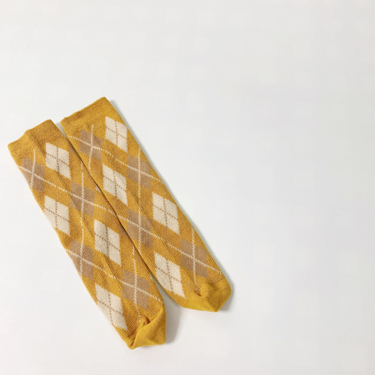 가을과 겨울 새로운 빈티지 마름모 어린이 양말 더블 바늘 더블 경로 격자 무늬 유행 어린이 통기성면 양말 더미 양말스토어 가기