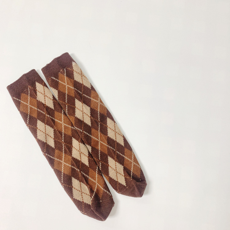 가을과 겨울 새로운 빈티지 마름모 어린이 양말 더블 바늘 더블 경로 격자 무늬 유행 어린이 통기성면 양말 더미 양말