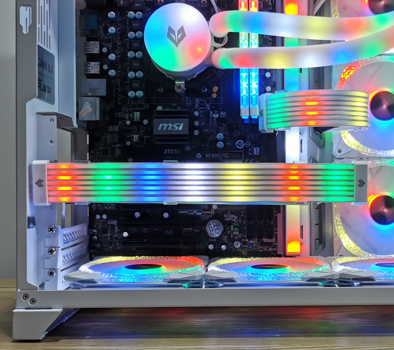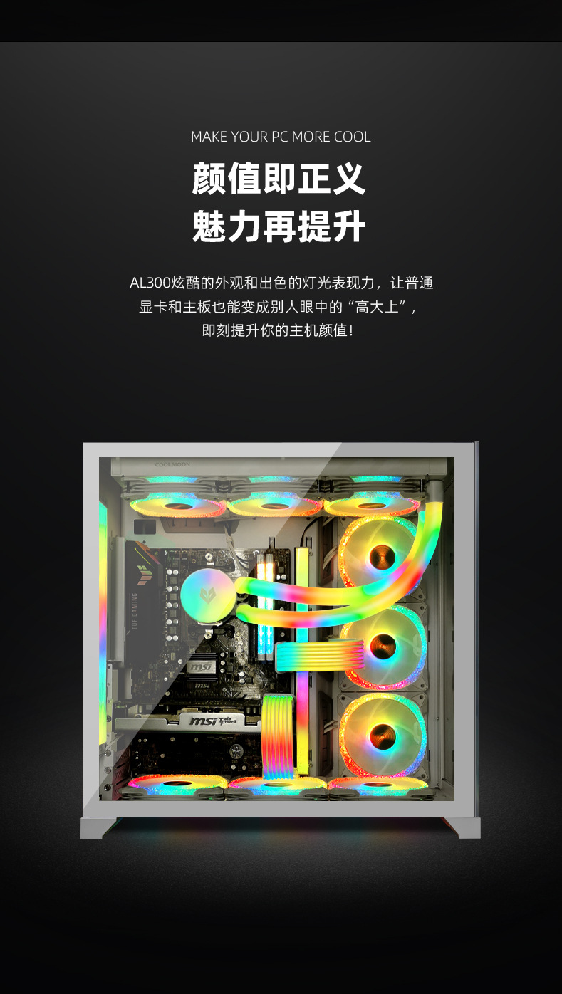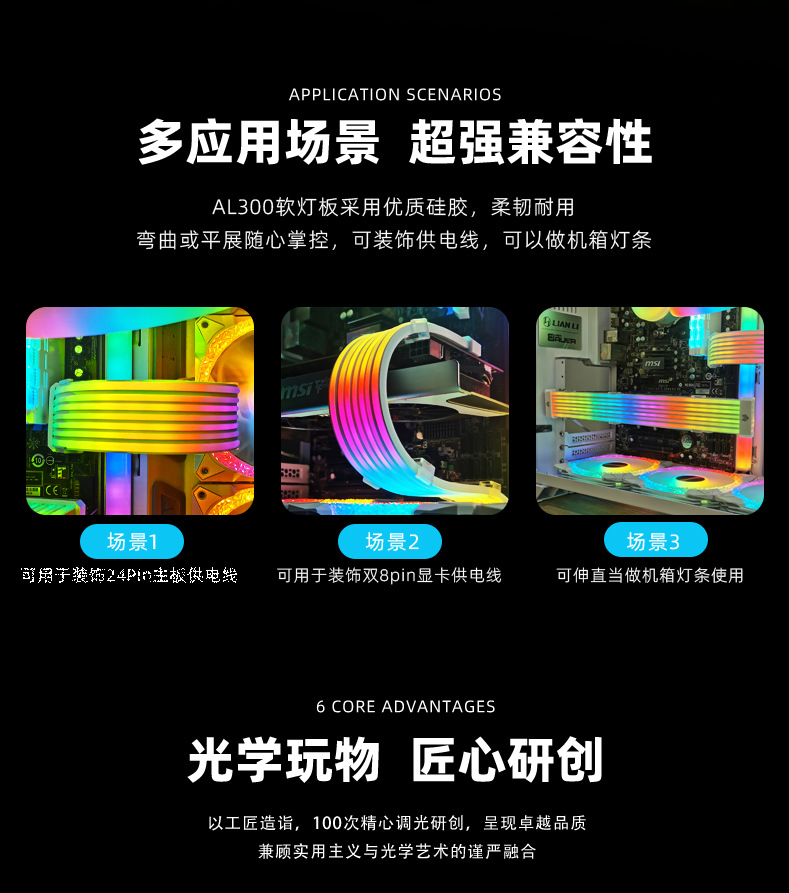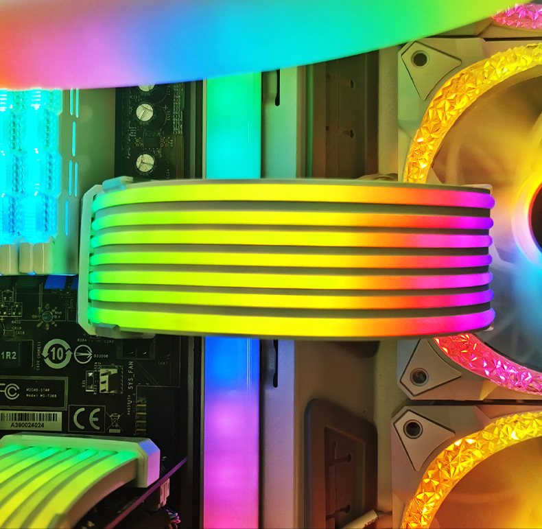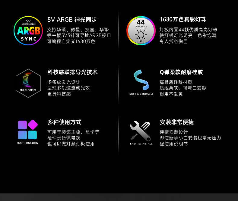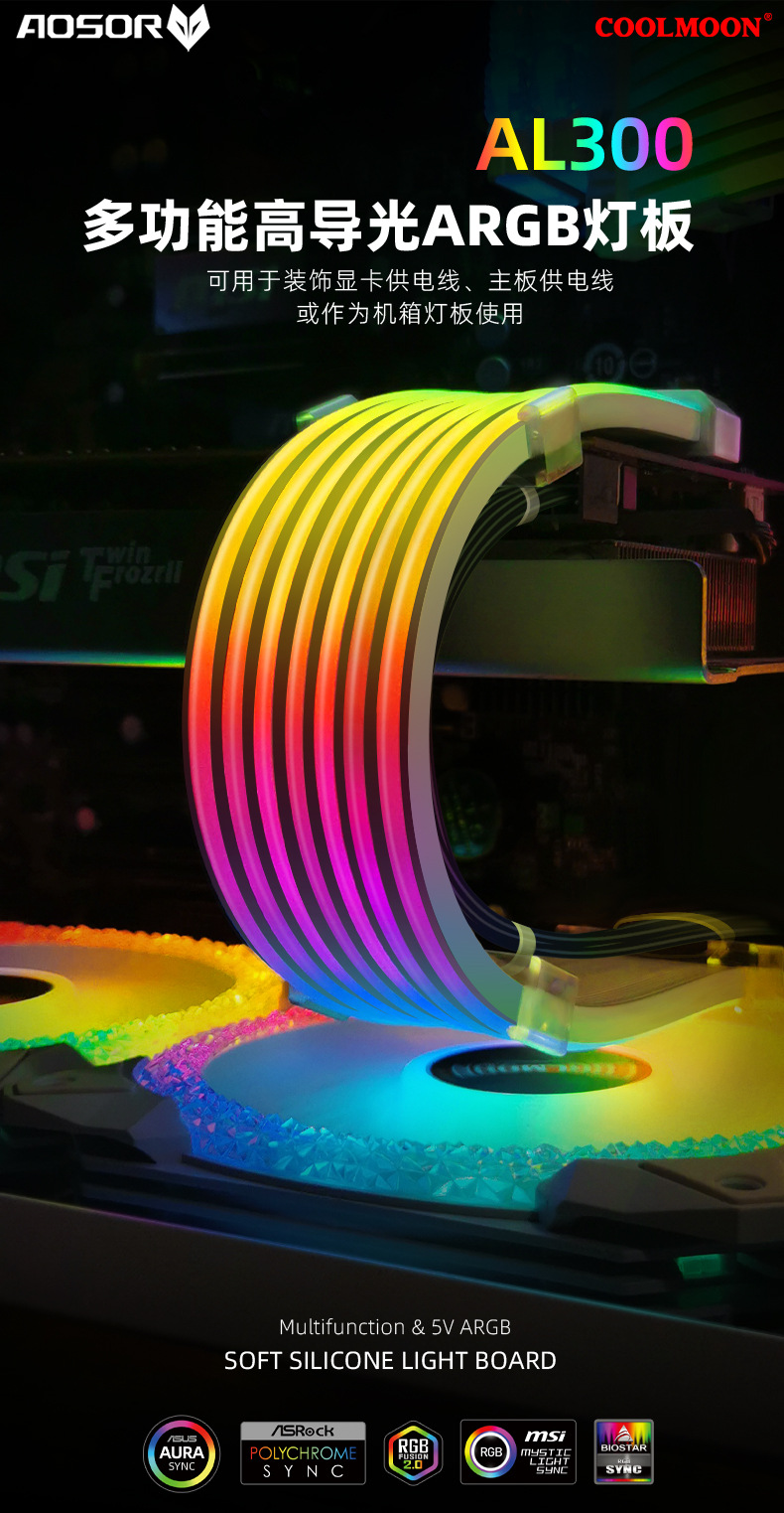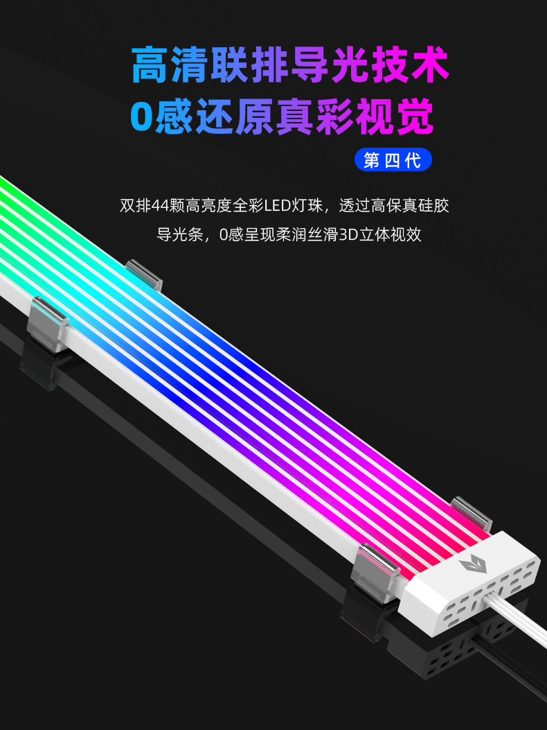 酷月AL系列ARGB发光线,柔软硅胶材质,用于遮挡显卡与主板供电线,炫酷发光,精美彩盒包装,60pcs/box,单箱尺寸:45*34.5*34cm,14kg/box,支持跨境销售,可提供图片包,更多资讯请联系客服!