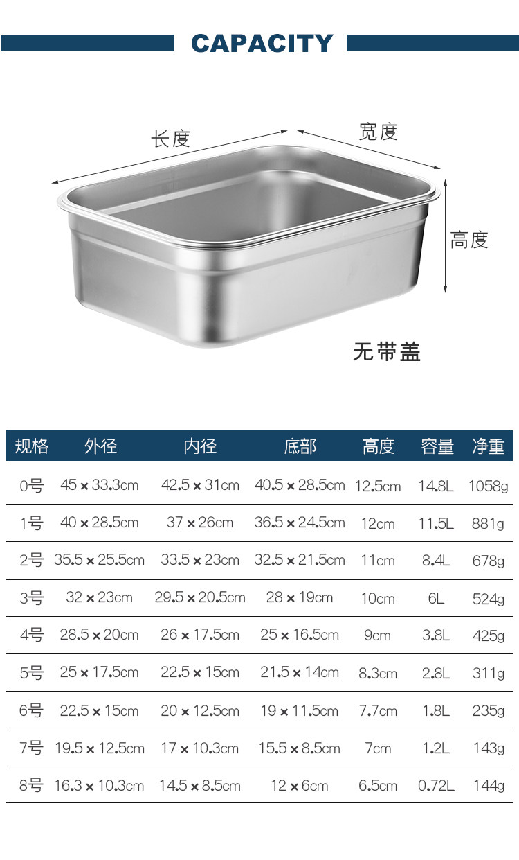 상업용 304 스테인레스 스틸 보존 상자 직사각형 도시락 뚜껑 냉동고 접시 디스플레이 야채 분지 대용량