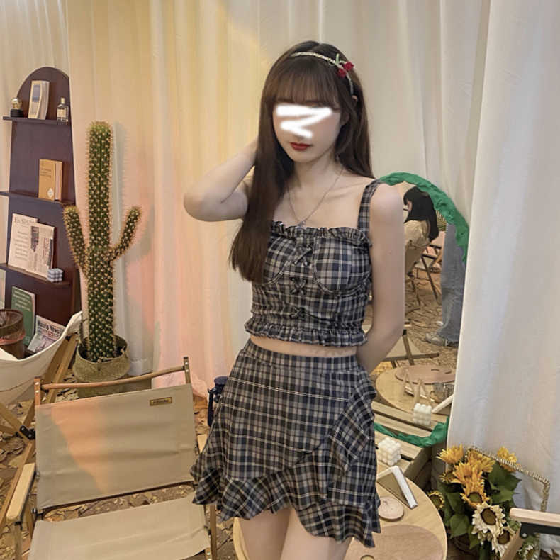 수영복 여성용 스트랩 스플릿 투피스 수영복 소녀 복고풍 격자 무늬 수영복 보수적 인 슬림 전문 수영복 도매스토어 가기