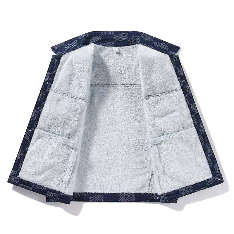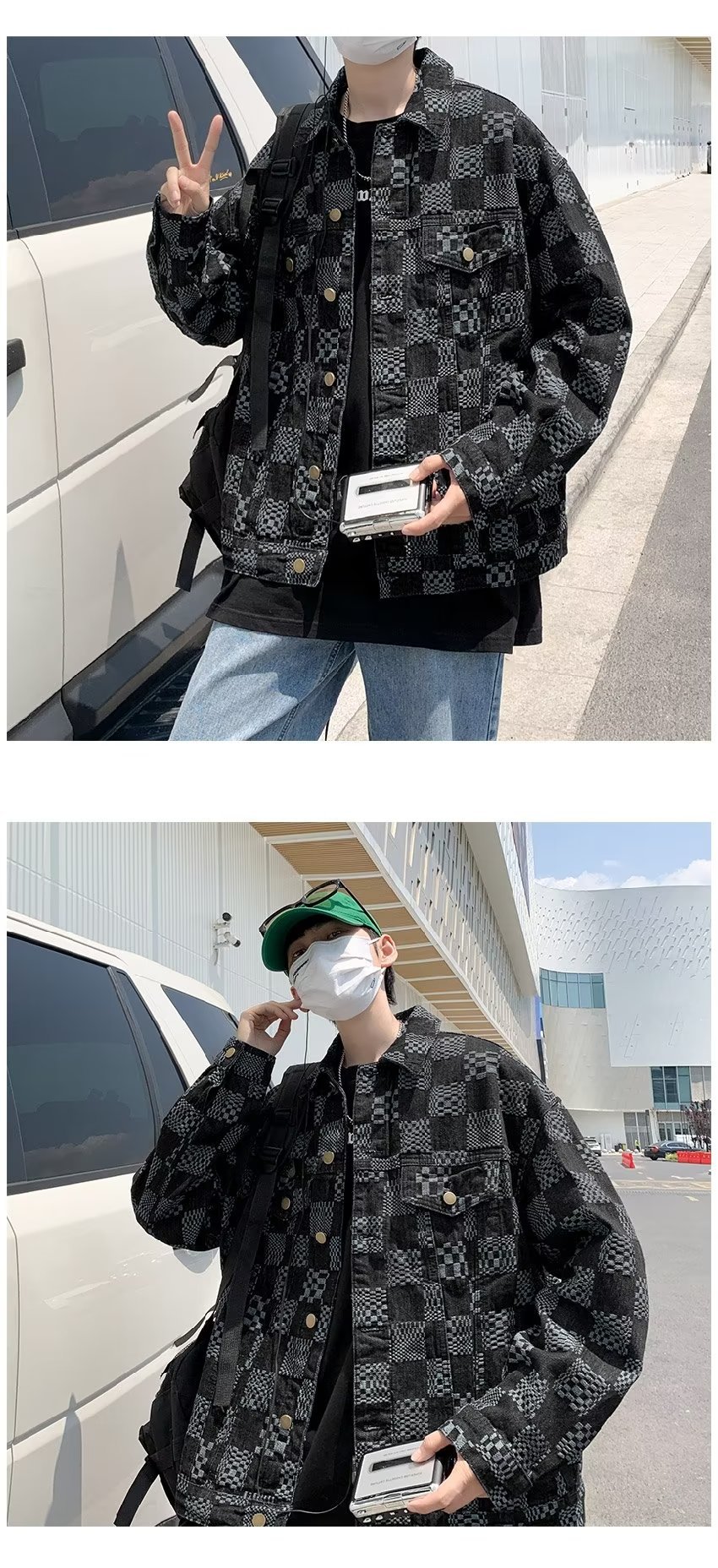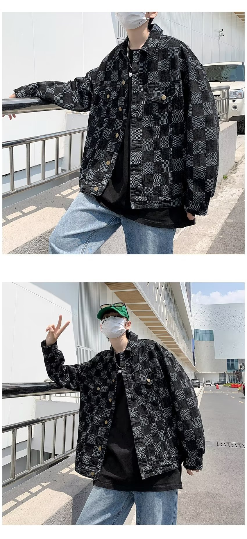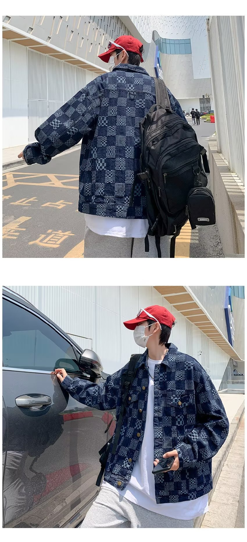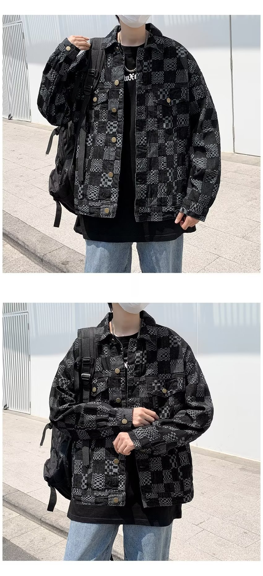 하이 엔드 감각 개인 자카드 데님 재킷 남자의 가을과 겨울 커플 남자와 여자의 느슨한 체스 판 격자 무늬 캐주얼 재킷 유행