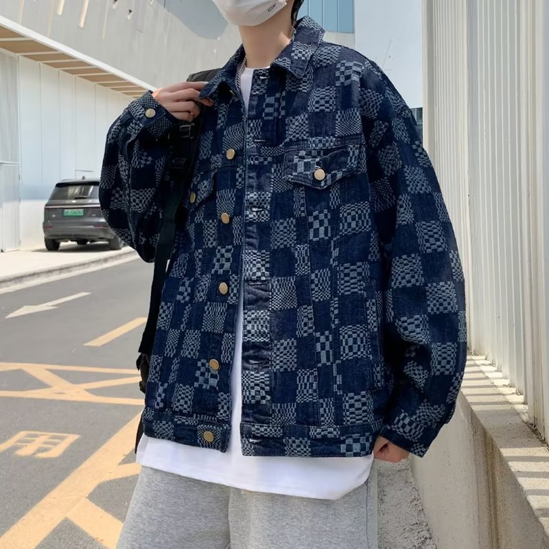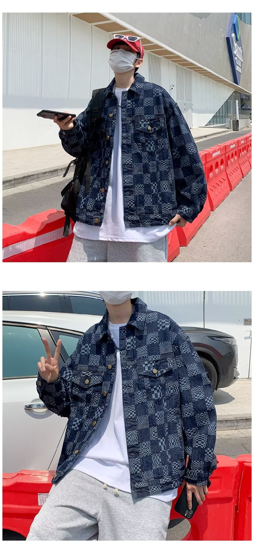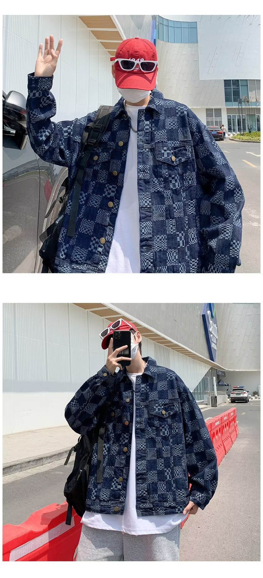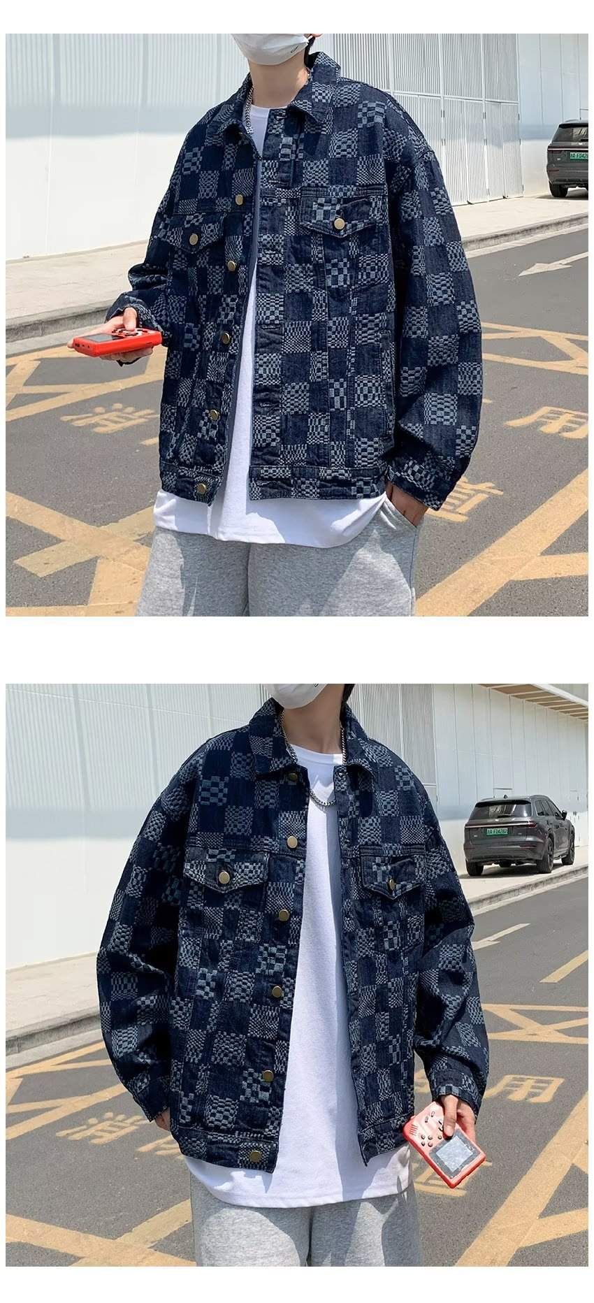 하이 엔드 감각 개인 자카드 데님 재킷 남자의 가을과 겨울 커플 남자와 여자의 느슨한 체스 판 격자 무늬 캐주얼 재킷 유행스토어 가기