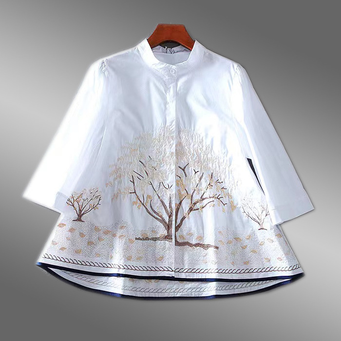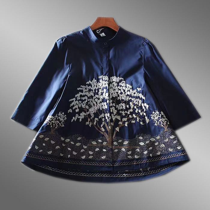 국경을 넘어 인기 있는 플러스 사이즈 여성복 디자인, 레트로 패턴의 정교한 자수, 루즈핏 9부 소매 셔츠 탑스토어 가기