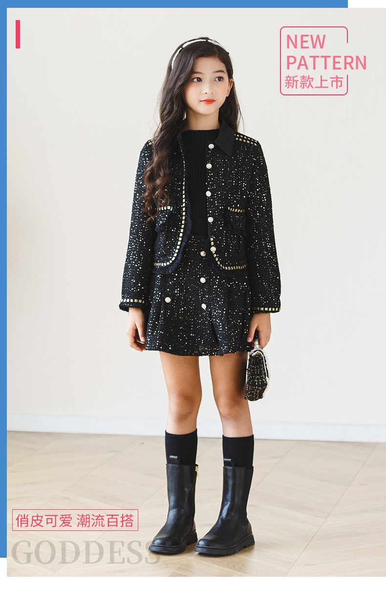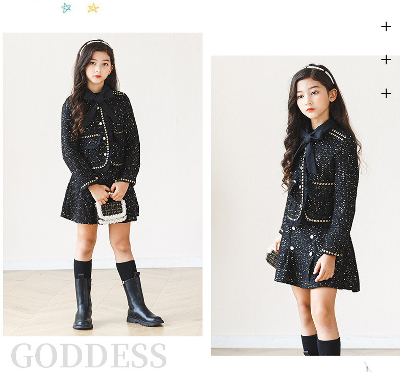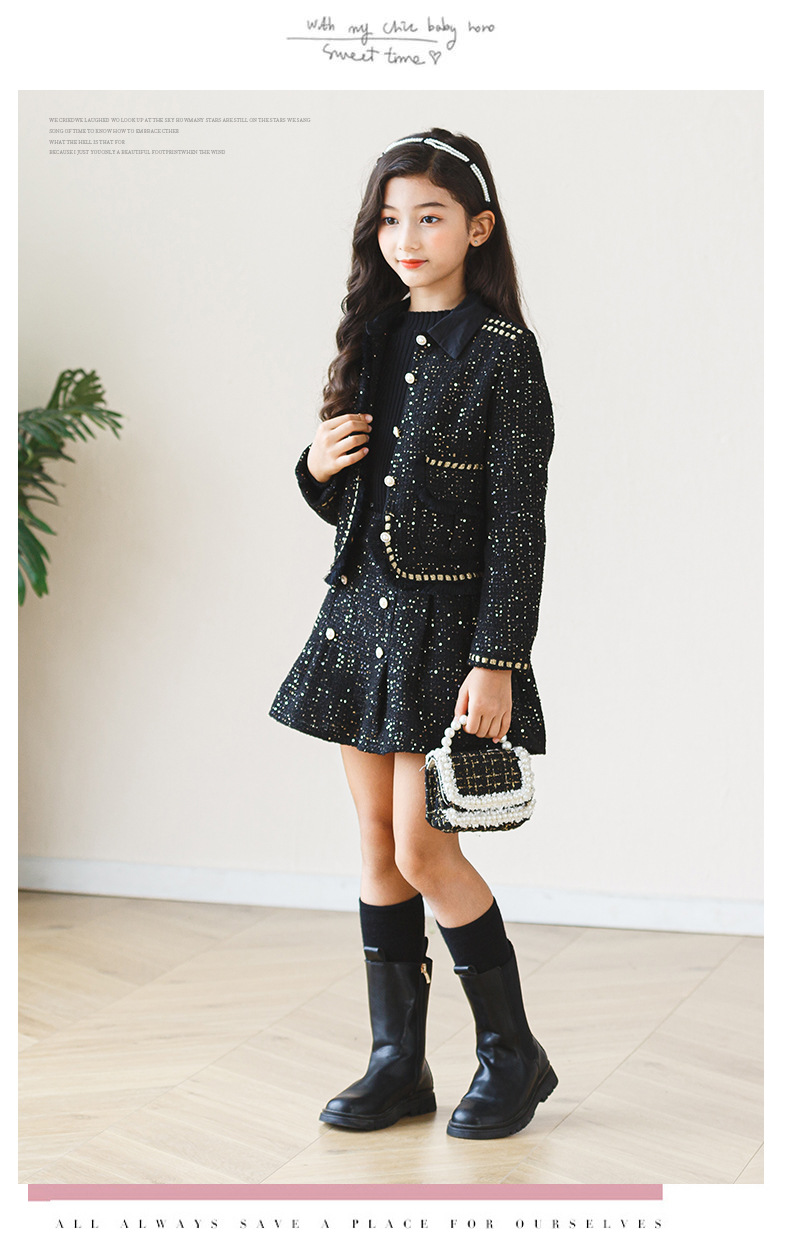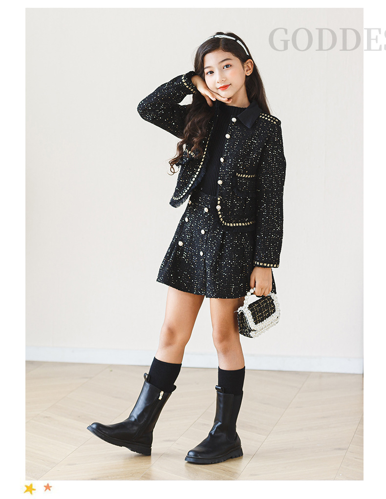 어린이 소녀 가을, 겨울 새로운 스타일 2024 패션 한국 스타일 공주 드레스 블랙 작은 향기로운 재킷 하프 스커트 투피스 세트스토어 가기