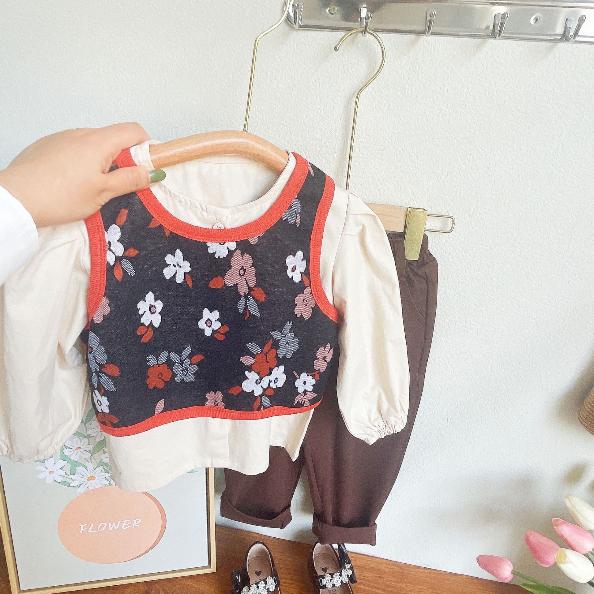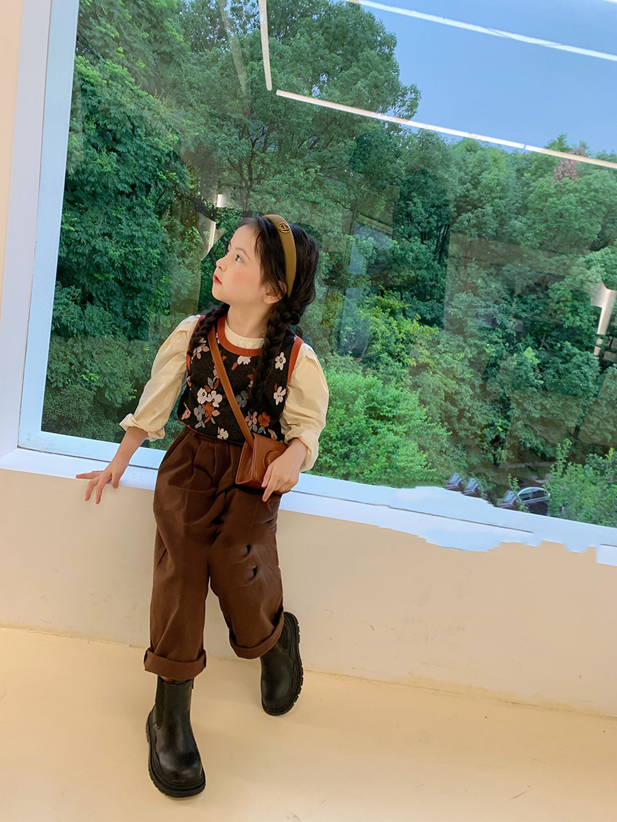 어린이 의류 도매 소녀 세트 가을 새 소녀 작은 꽃 조끼 긴 소매 셔츠 플러스 바지 3 피스 세트스토어 가기