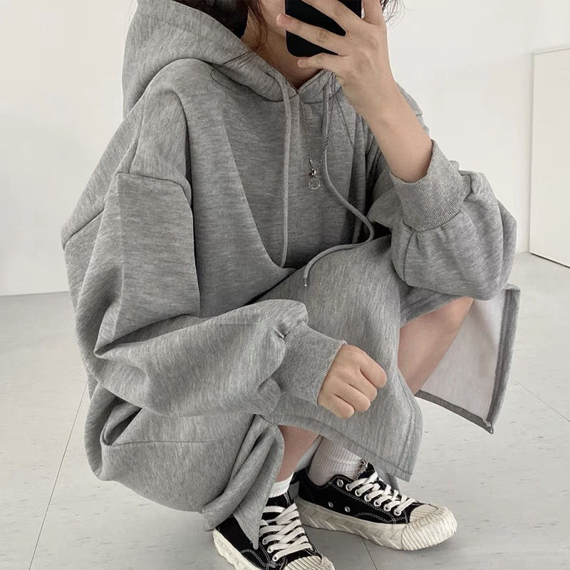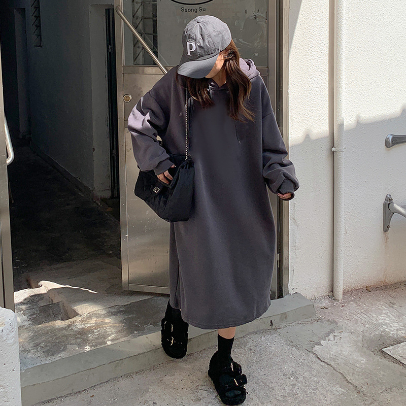 가을과 겨울 후드 풀오버 롱 스웨터 여자의 한국 스타일 느슨한 슬리밍 중간 길이 오버 무릎 스플릿 기모 원피스스토어 가기