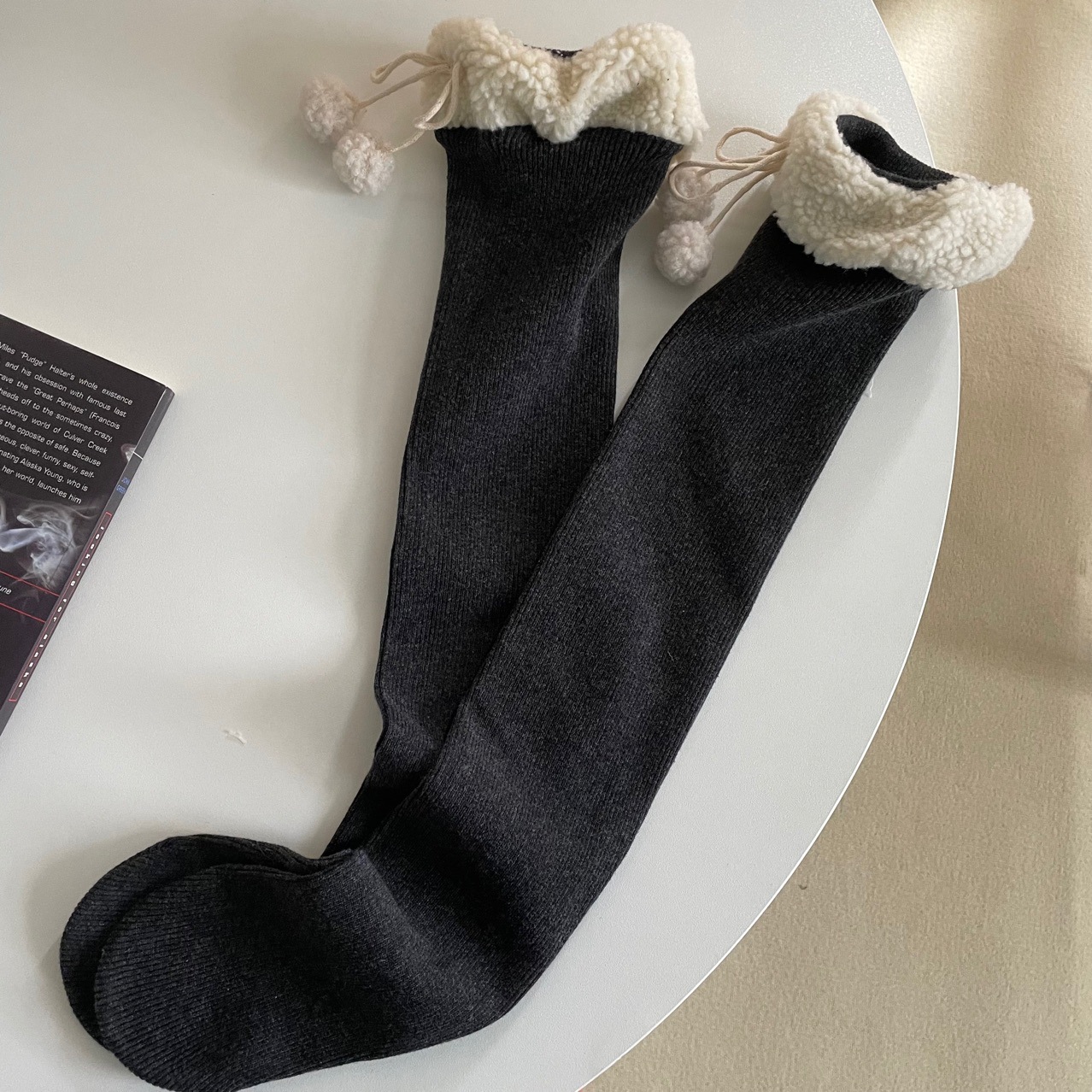 가을과 겨울 일본 로리 부드러운 귀여운 소녀의 모피 공 양모의 양모 중간 배럴 쌓인 양말 기모 따뜻한 수직 줄무늬 송아지