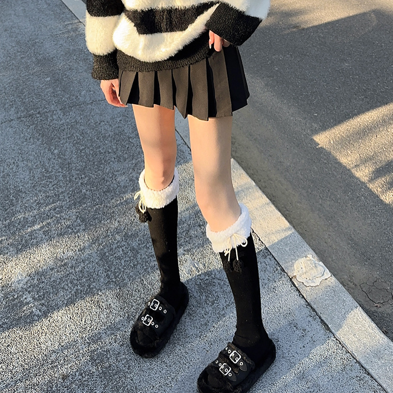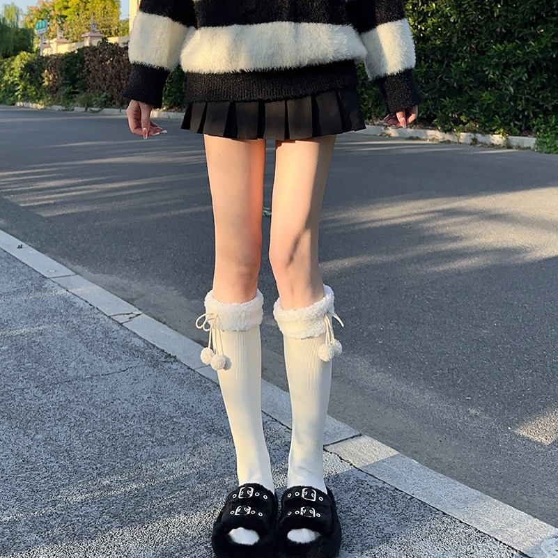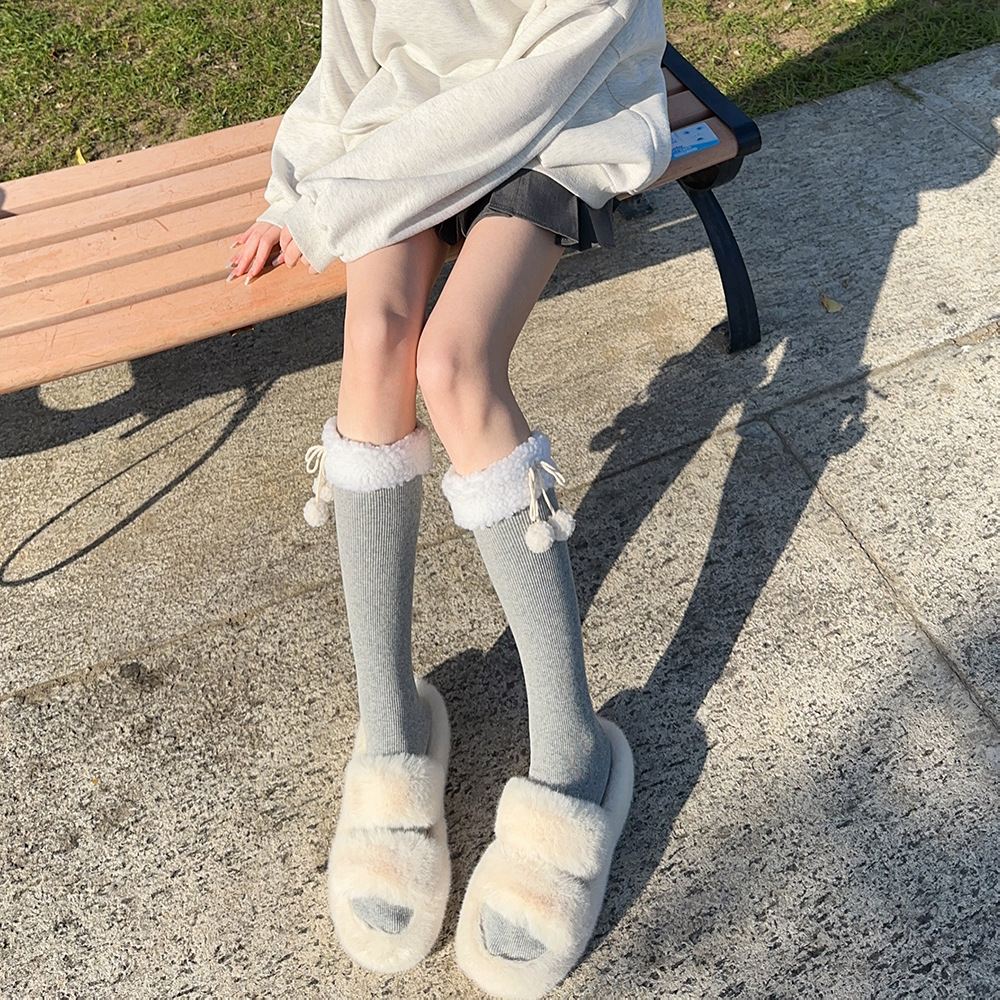 가을과 겨울 일본 로리 부드러운 귀여운 소녀의 모피 공 양모의 양모 중간 배럴 쌓인 양말 기모 따뜻한 수직 줄무늬 송아지스토어 가기