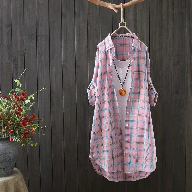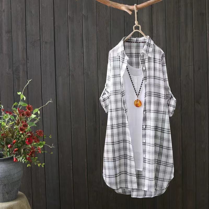 긴팔 체크 셔츠 여성용 중간 길이 2023 여름 새로운 슬리밍 웨스턴 스타일 루즈한 가디건 자외선 차단제 코트 셔츠