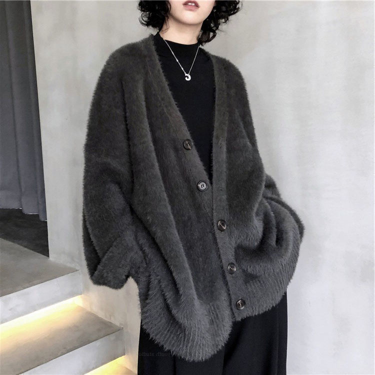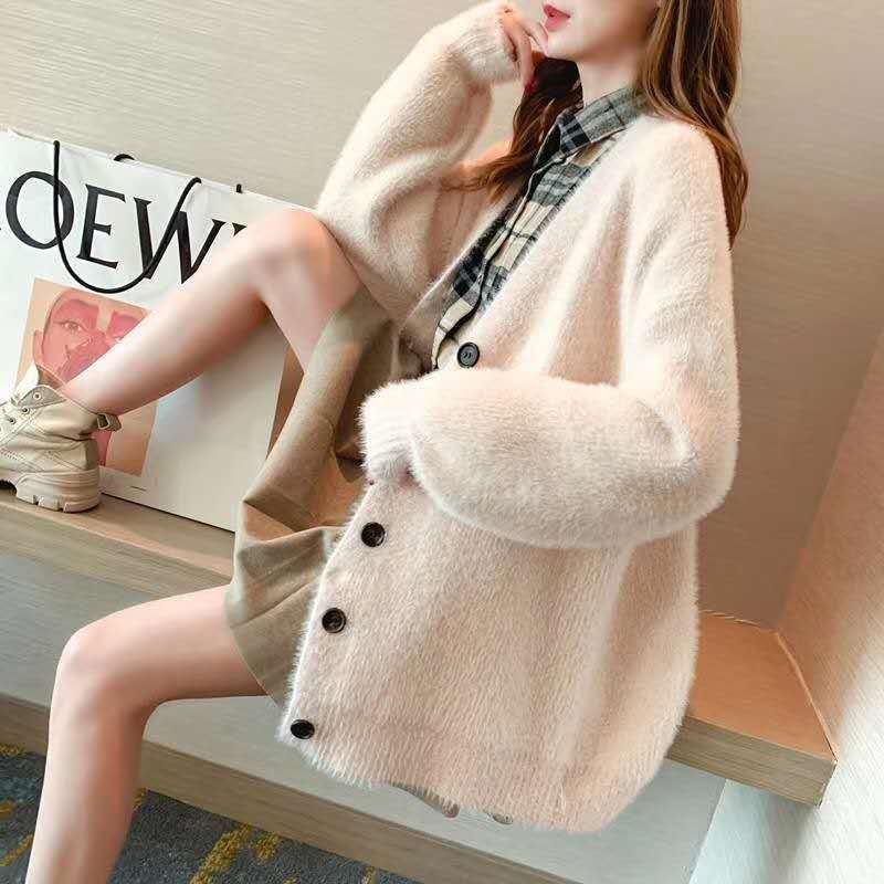 2025년 신상 한국 스타일 밍크 벨벳 브이넥 니트 가디건 루즈핏 캐주얼 스타일 인기 두꺼운 스웨터 여성용스토어 가기