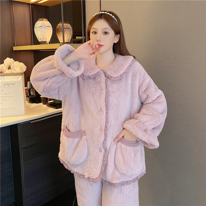 잠옷 여성의 겨울 따뜻한 새로운 두꺼운 양면 벨벳 인형 칼라 카디건 긴 소매 바지 세트 홈 웨어스토어 가기