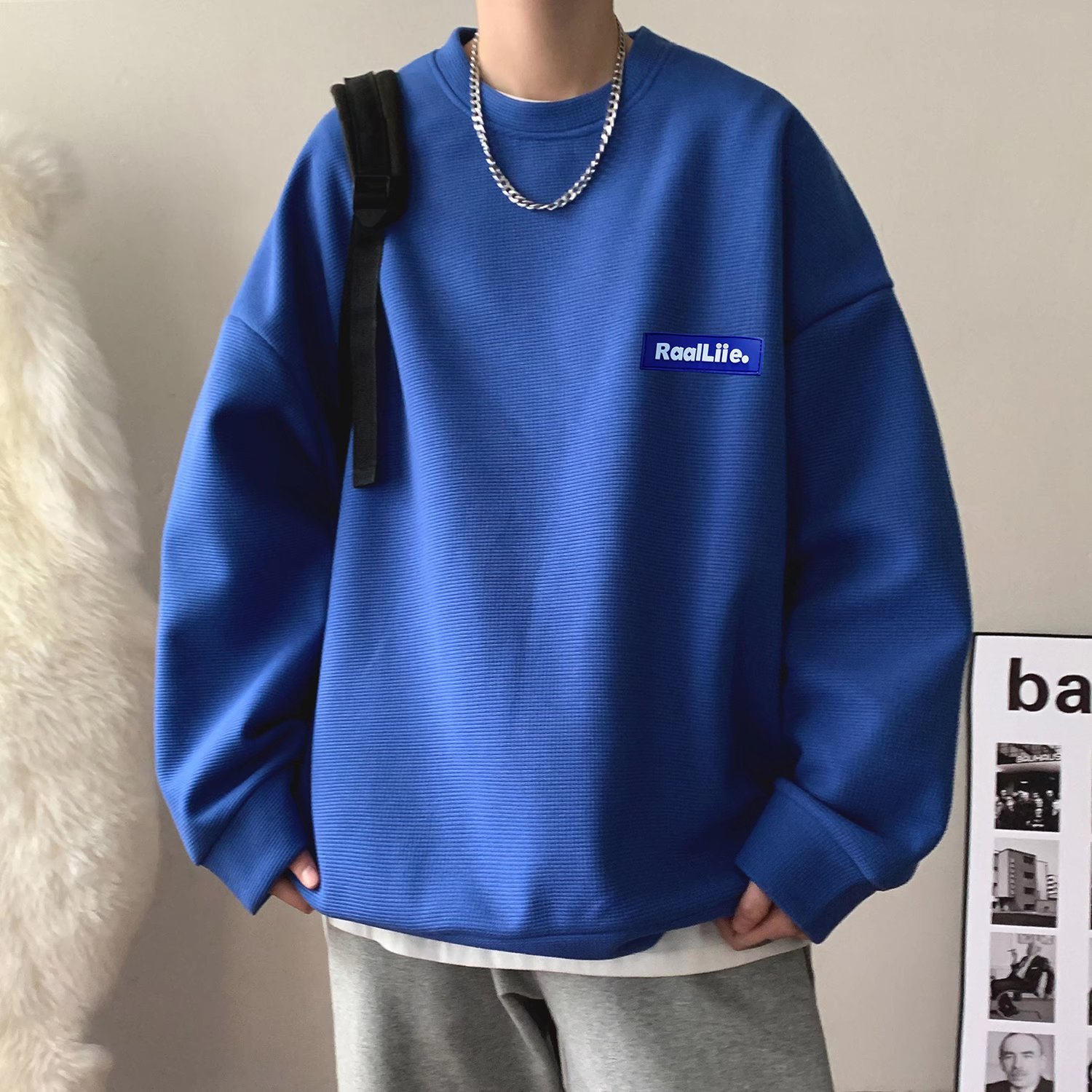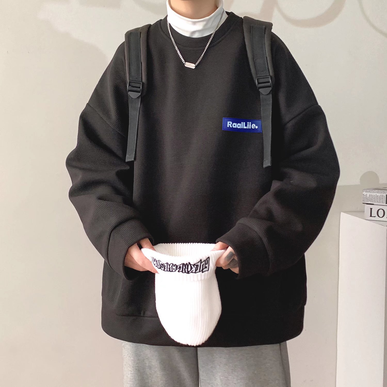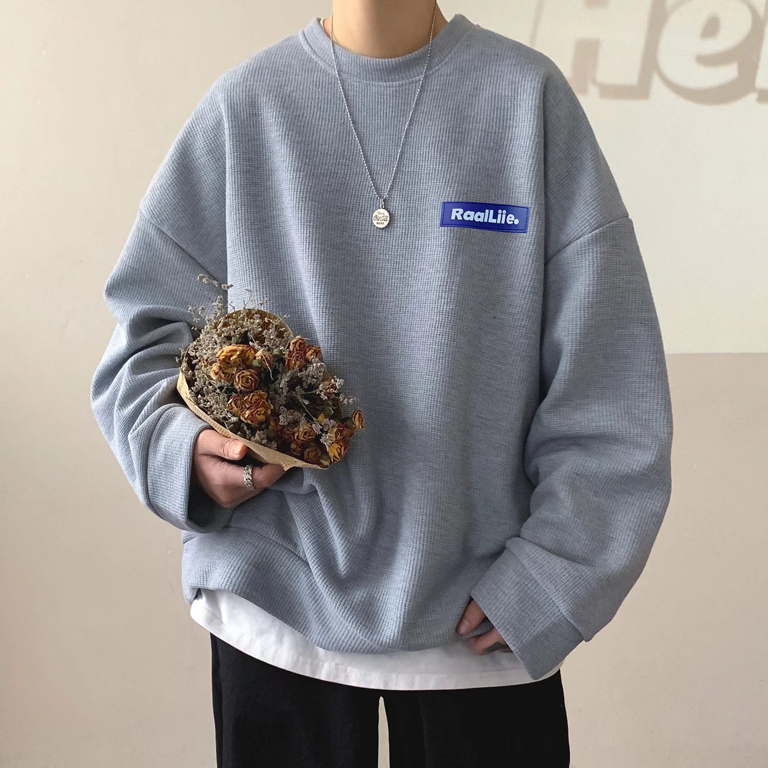 남성용 스웨터 남성용 디자인 센스 틈새 트렌디 브랜드 스트리트 아메리칸 느슨한 크루넥 와플 봄과 가을 재킷 트렌디 남성스토어 가기