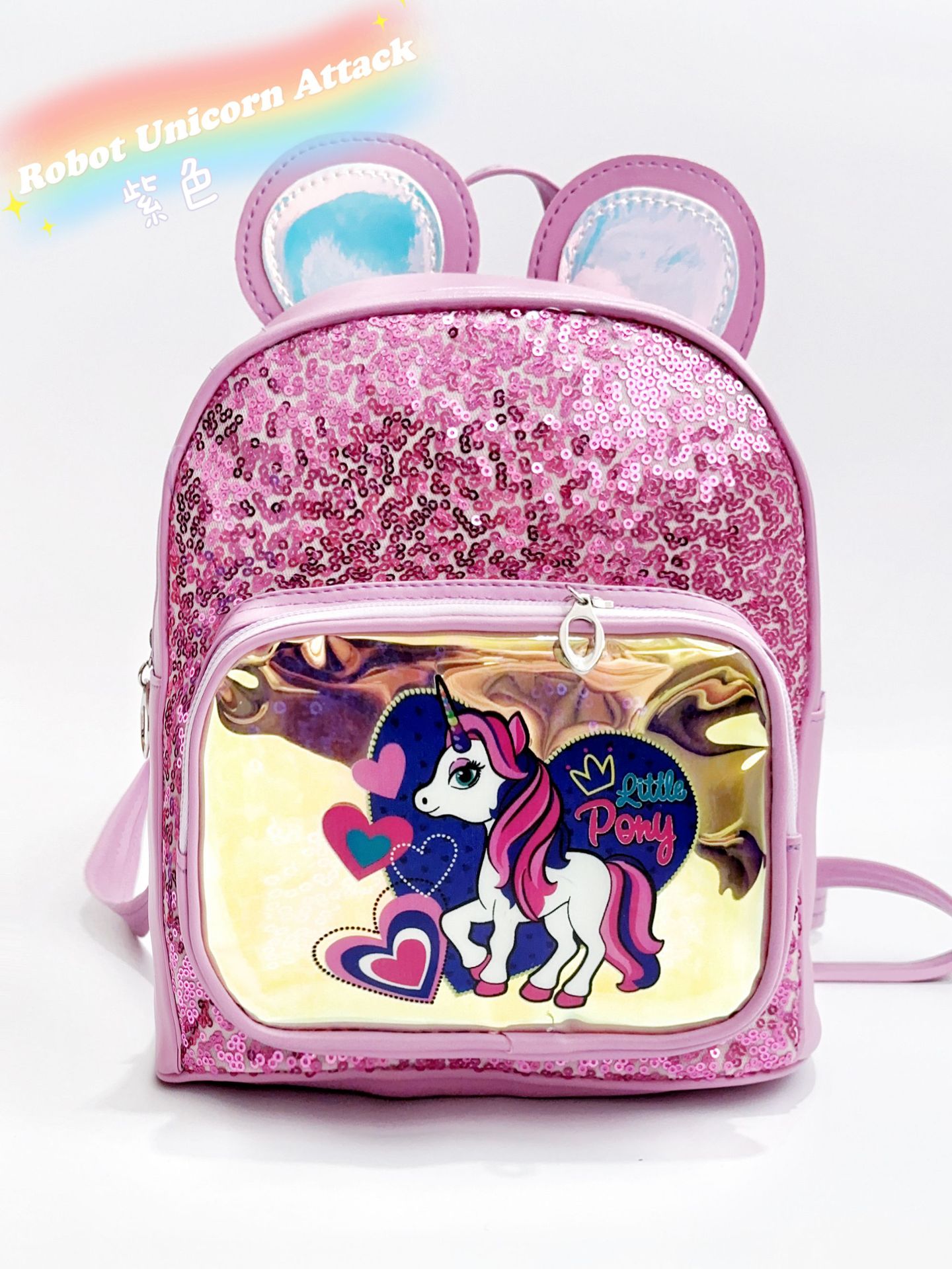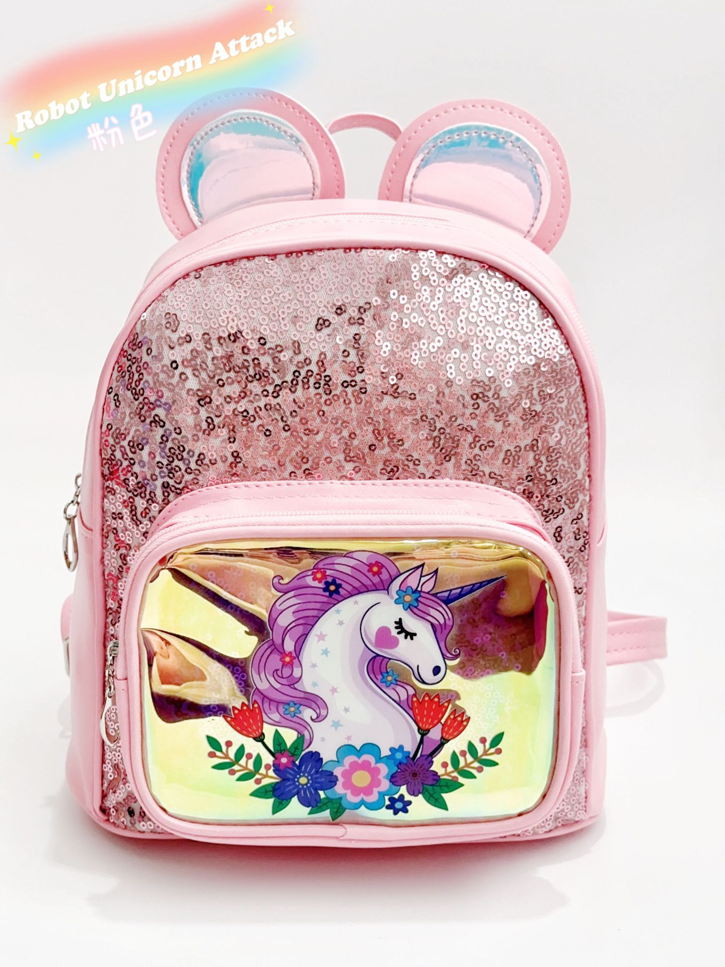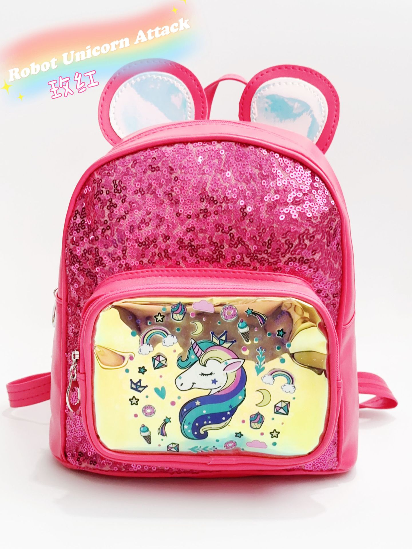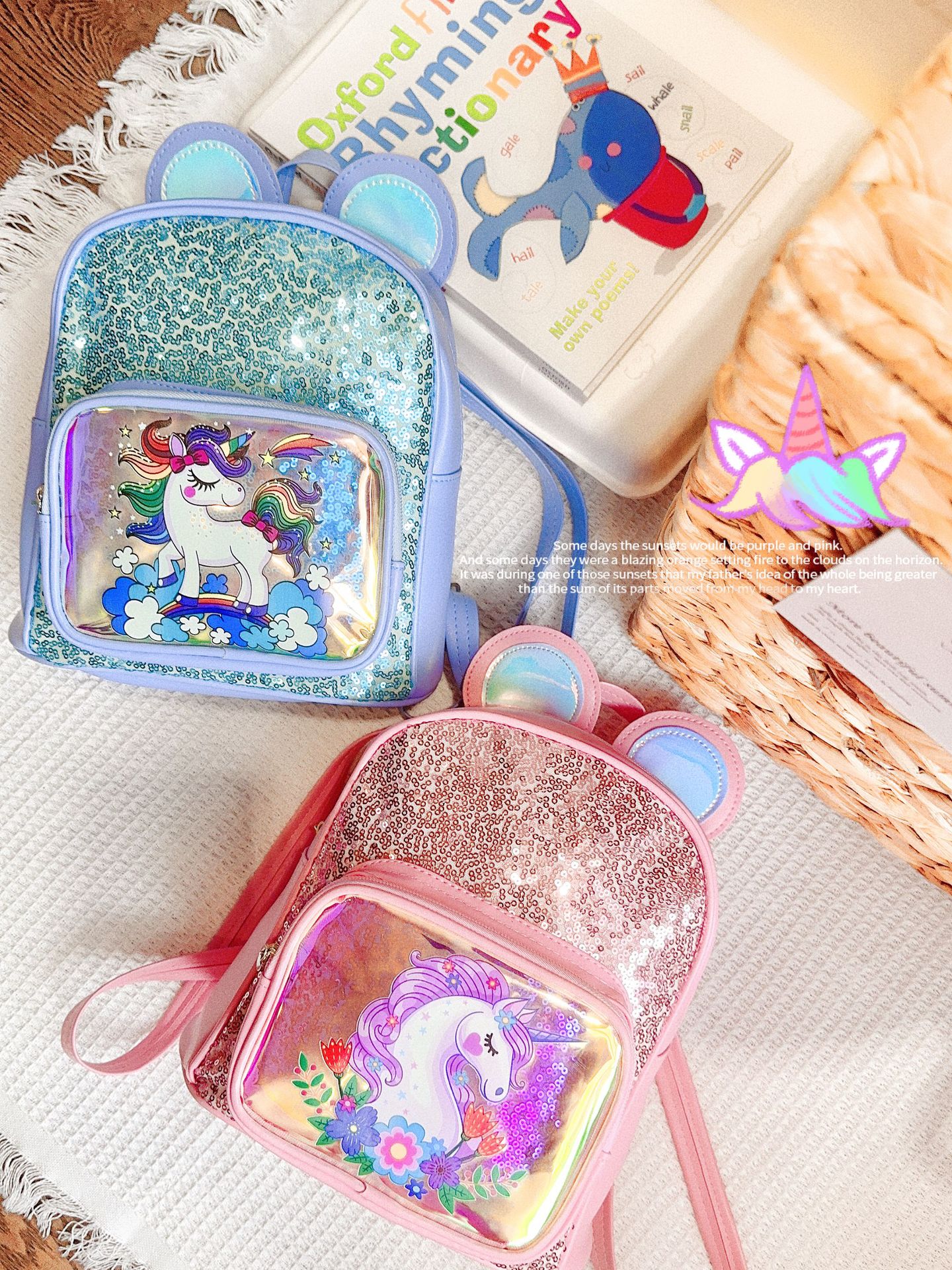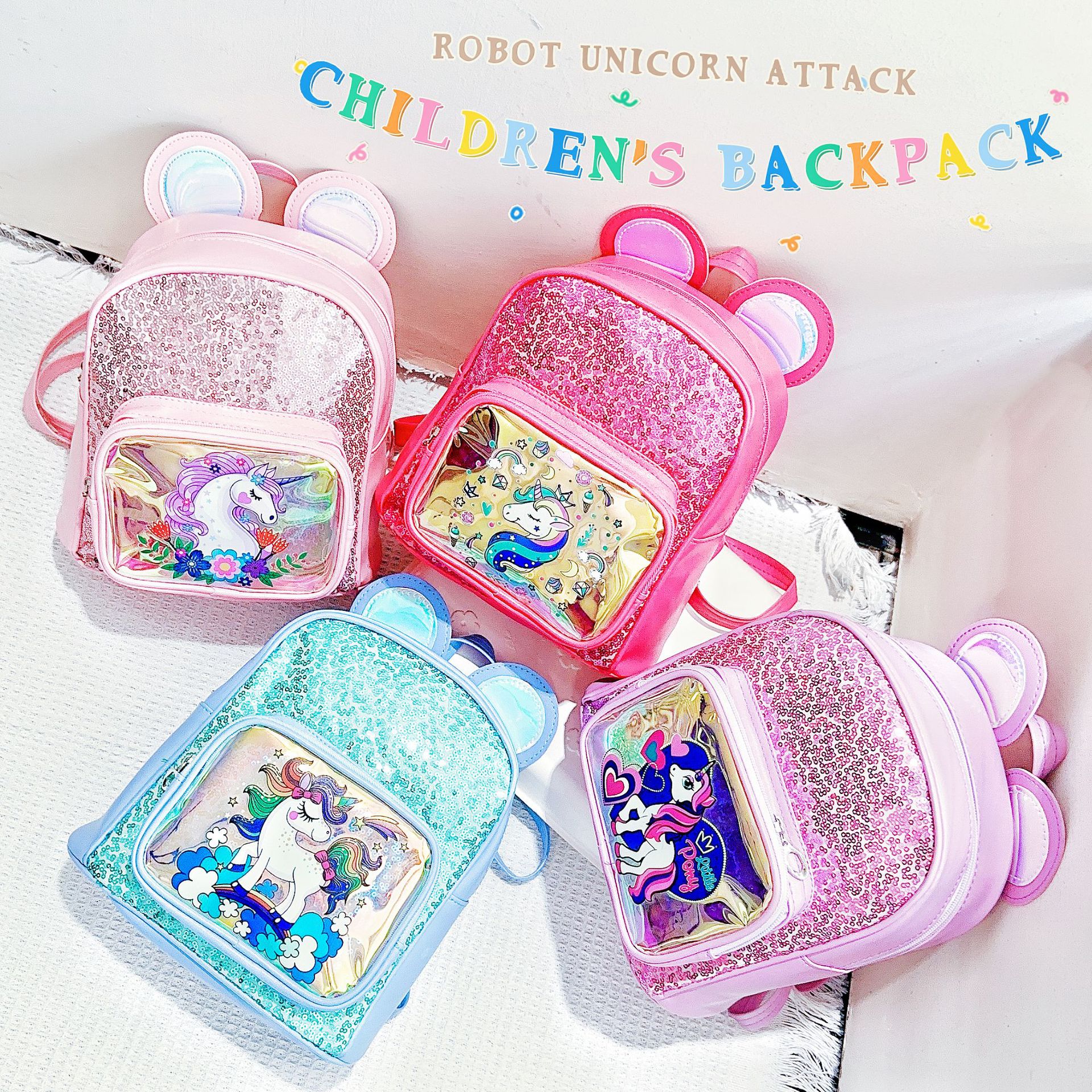 공장 도매 유니콘 백팩 패션 어린이 반짝이 조랑말 만화 여행 가방 여성용스토어 가기