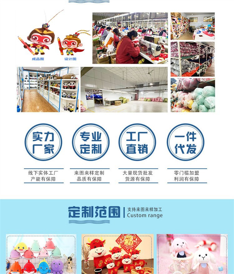 青岛大阿福商贸有限公司是等产品专业生产加工的公司,拥有完整、科学的质量管理体系。青岛大阿福商贸有限公司的诚信、实力和产品质量获得业界的认可。欢迎各界朋友莅临参观、指导和业务洽谈。经销批发的毛绒玩具、毛绒公仔畅销消费者市场,在消费者当中享有较高的地位,公司与多家零售商和代理商建立了长期稳定的合作关系。